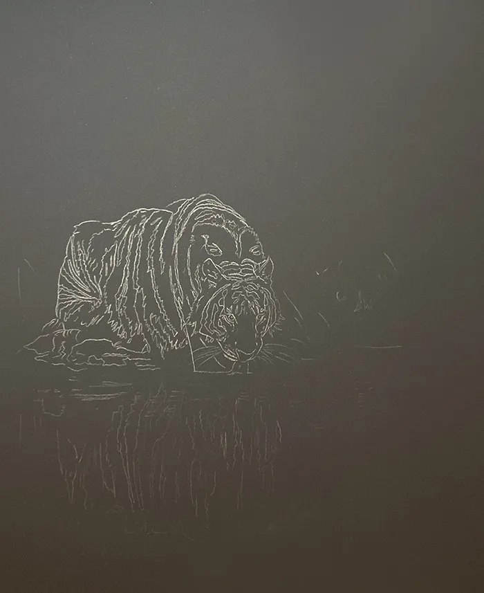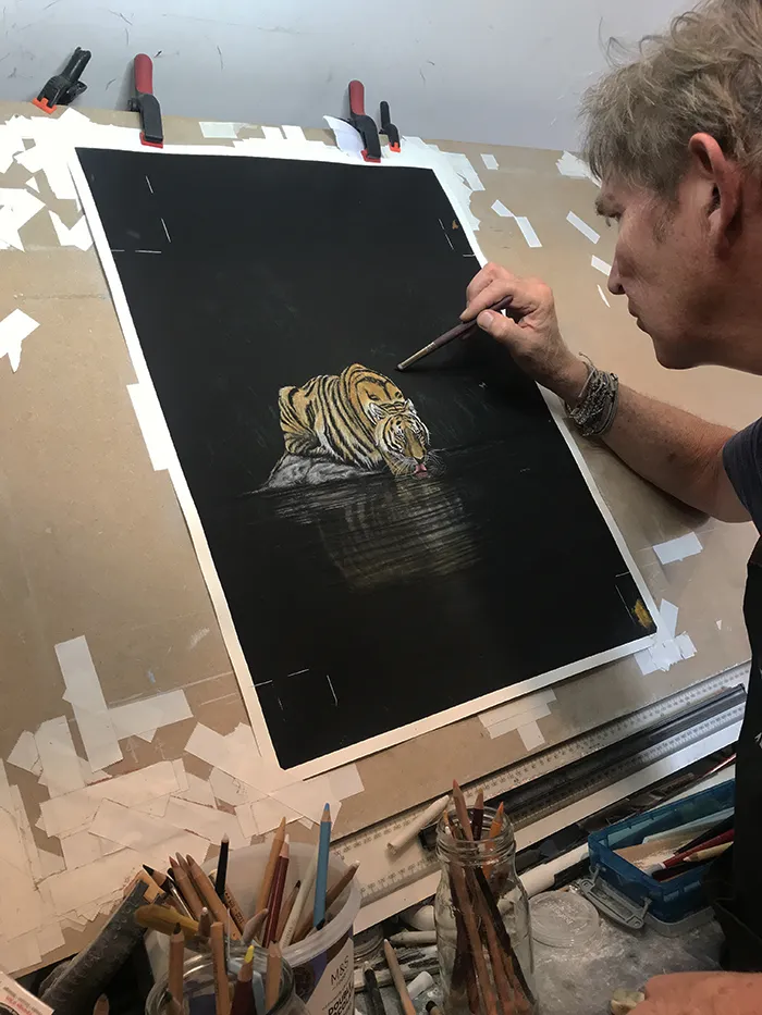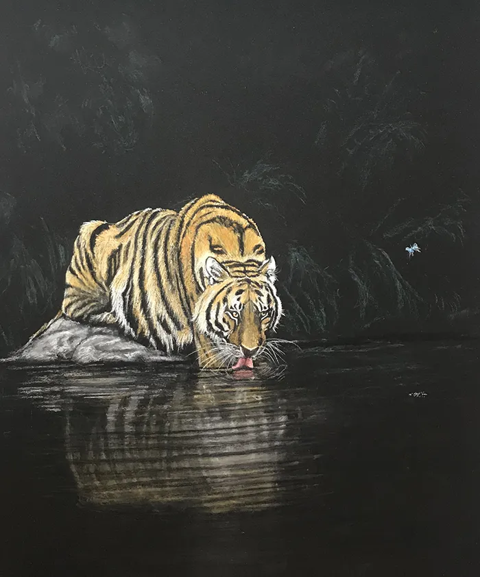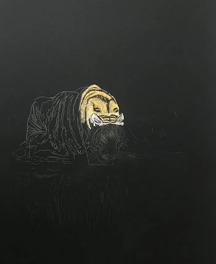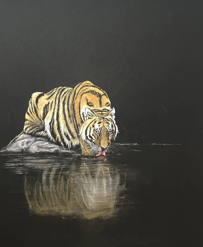 I've started with a light sketch in chalk of the tiger drinking on a black background
