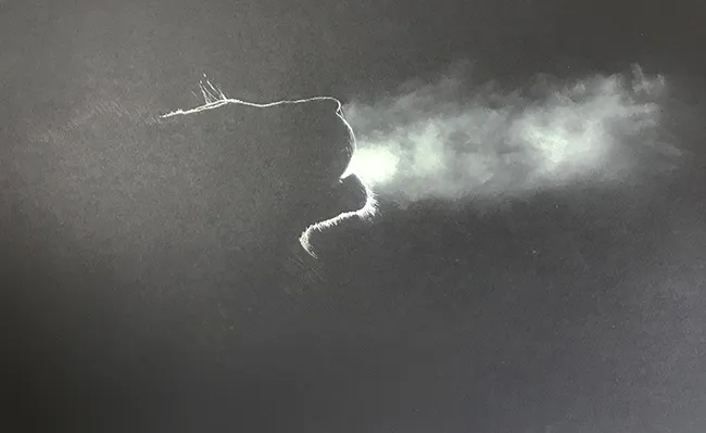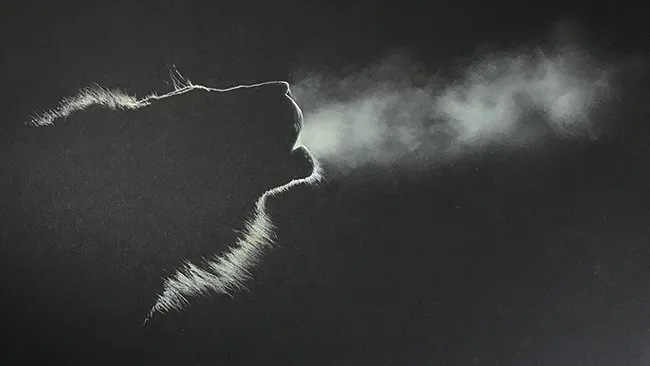 This is a chalk on black sketch of an adult male lion calling out during the early hours of the morning as it shows its breath in the still coldness.