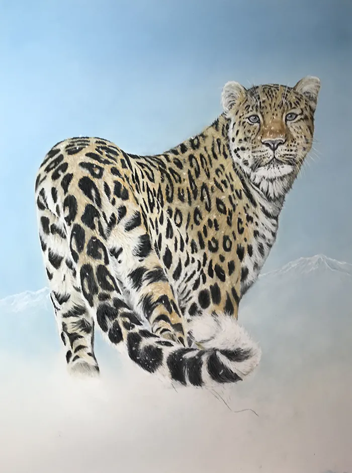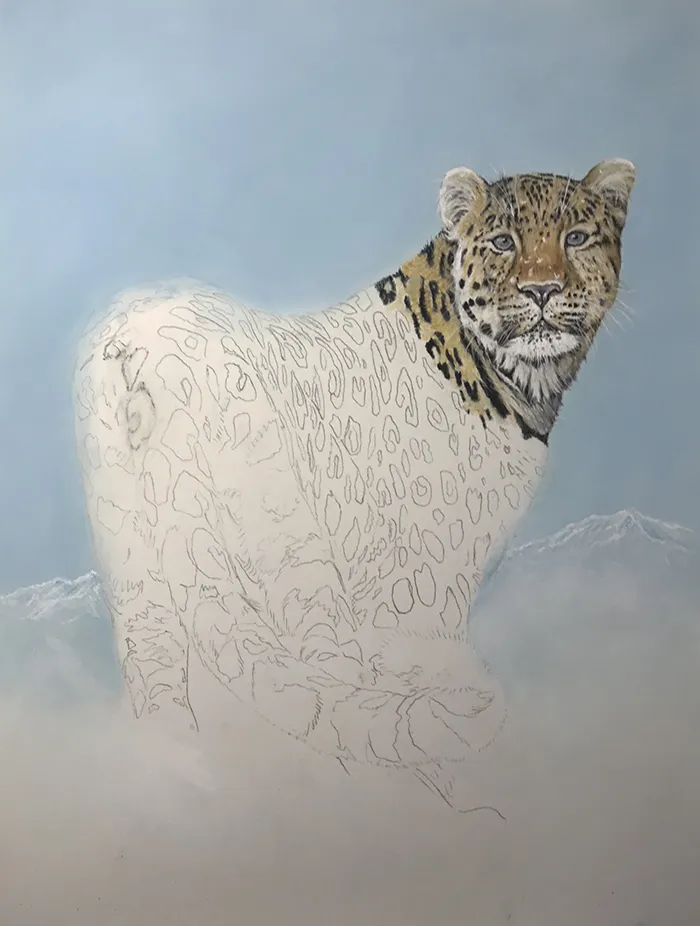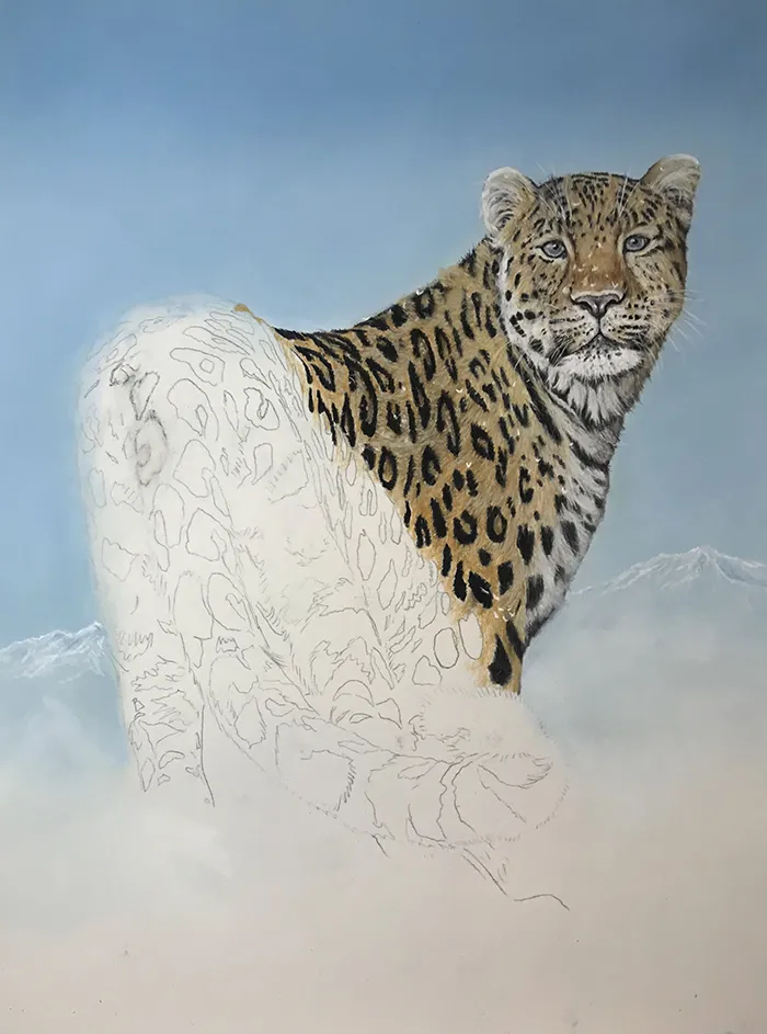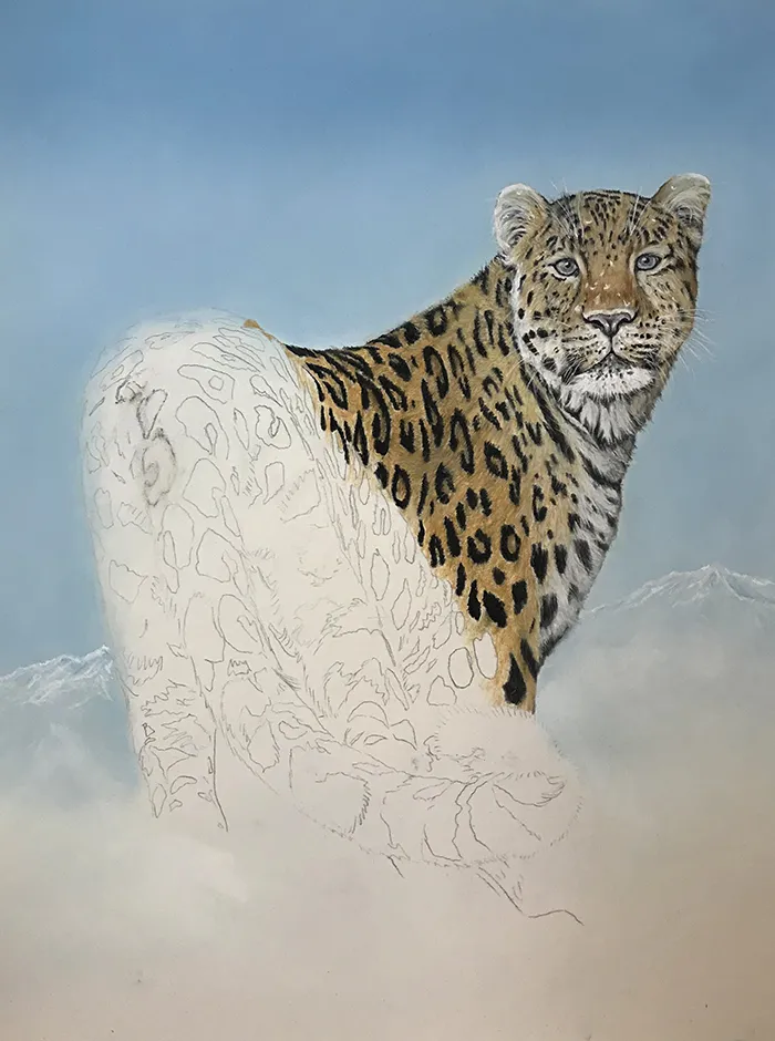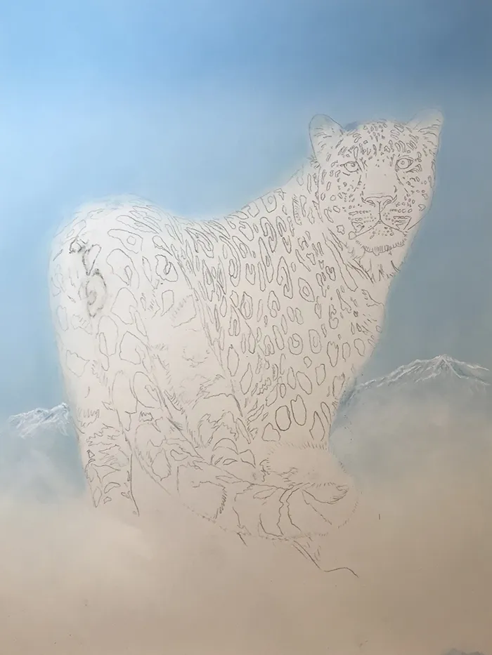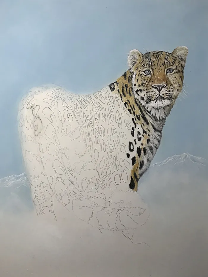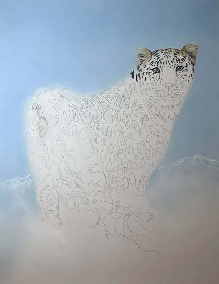 I've lightly sketched in the leopard, adding a PanPastel blue tint as a base for the background