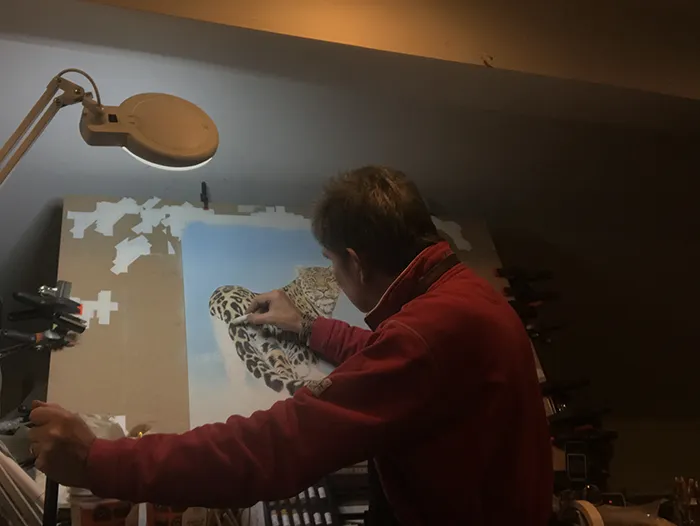 I'm adding the white highlights to the leopard's fur whilst using a bar to rest my wrist on