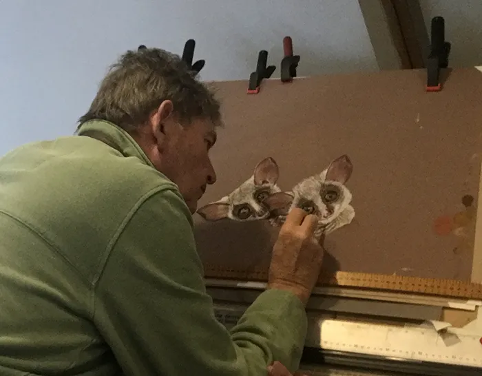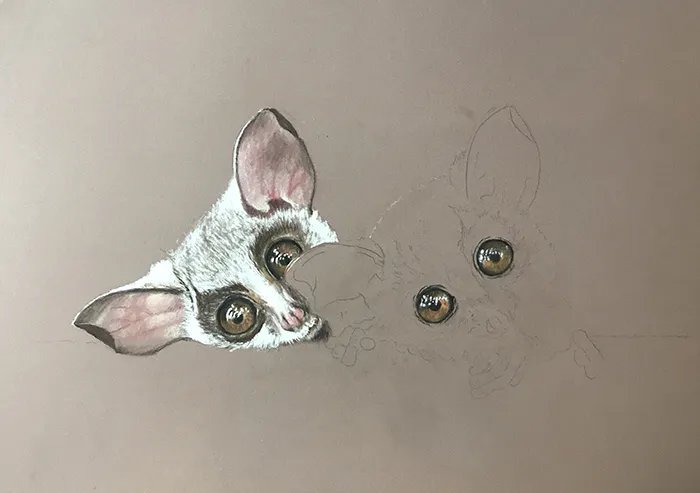 I started on their big eyes and then I've worked on the first bushbaby adding its large ears