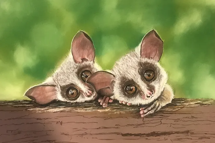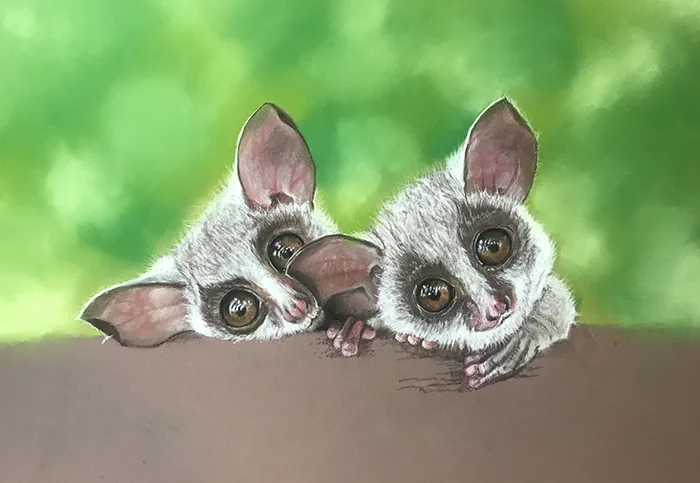 This image of two young bush babies has been sketched in the medium of Pastel on a PastelMat paper whilst using a series of beautiful photographs courtesy of Dustin Van Helsdingen.