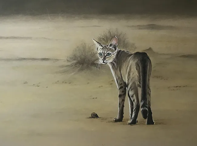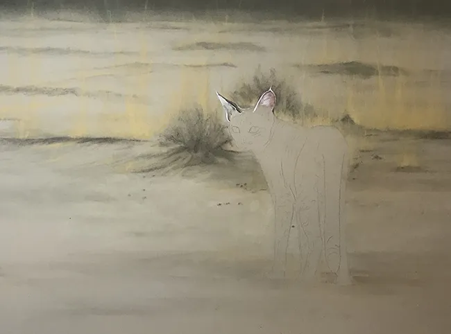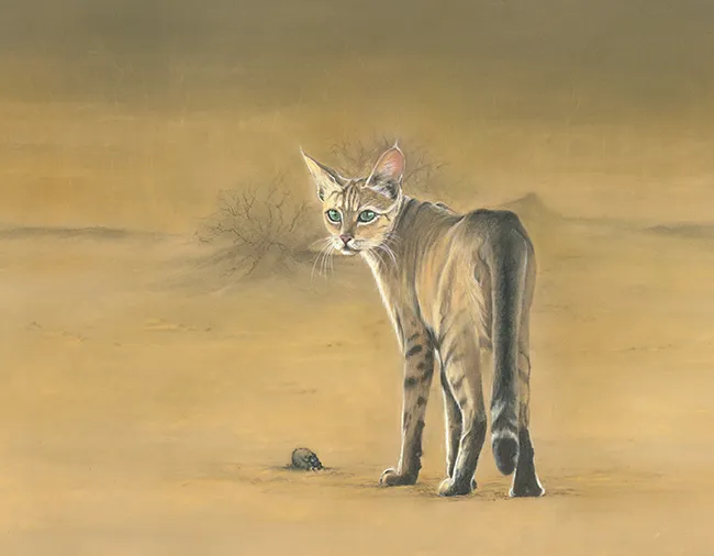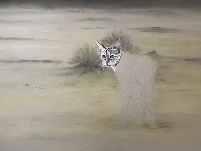 I've lightly sketched in the African wildcat glancing back, as a rough guide