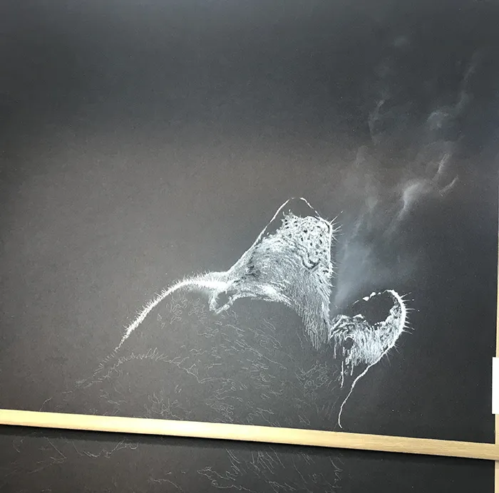 A sketch of a wolf using Chalk and Charcoal on black pastel paper.