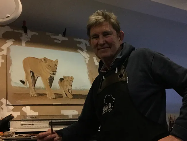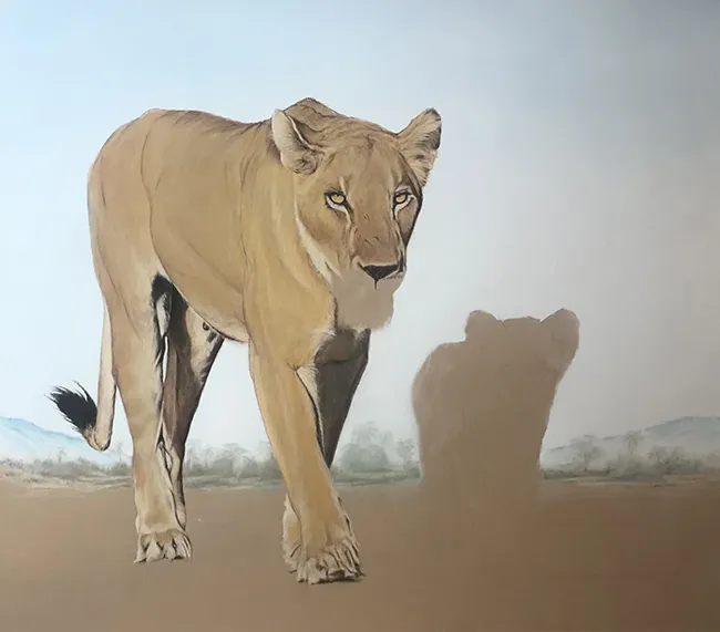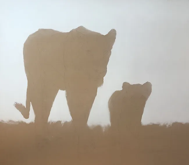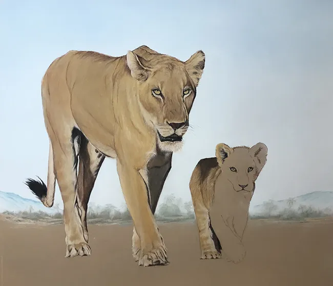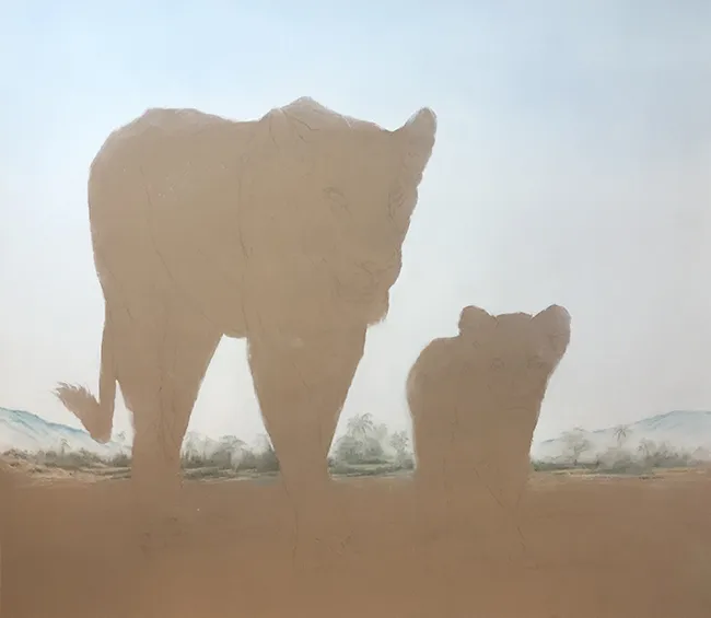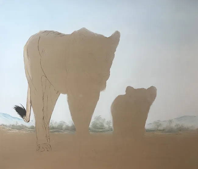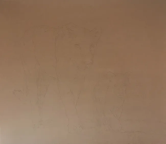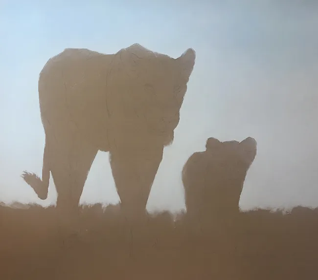 I've lightly pencilled in the image of the lioness and her cub in stride
