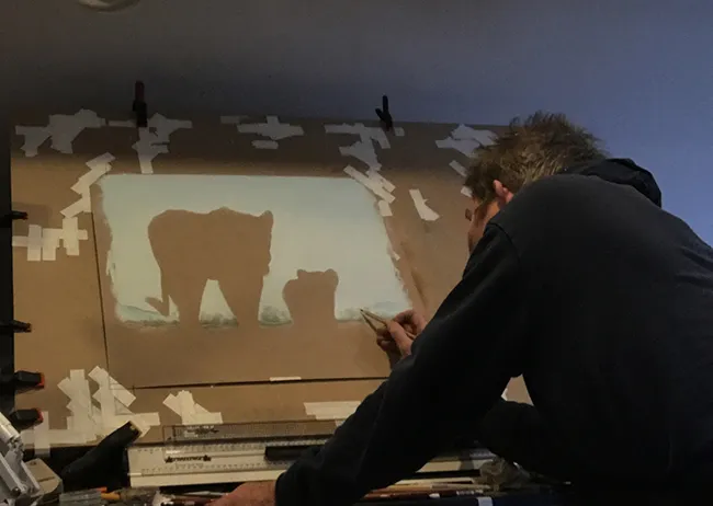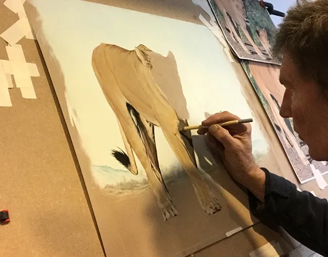 Working at my easel adding some fur to her upper leg