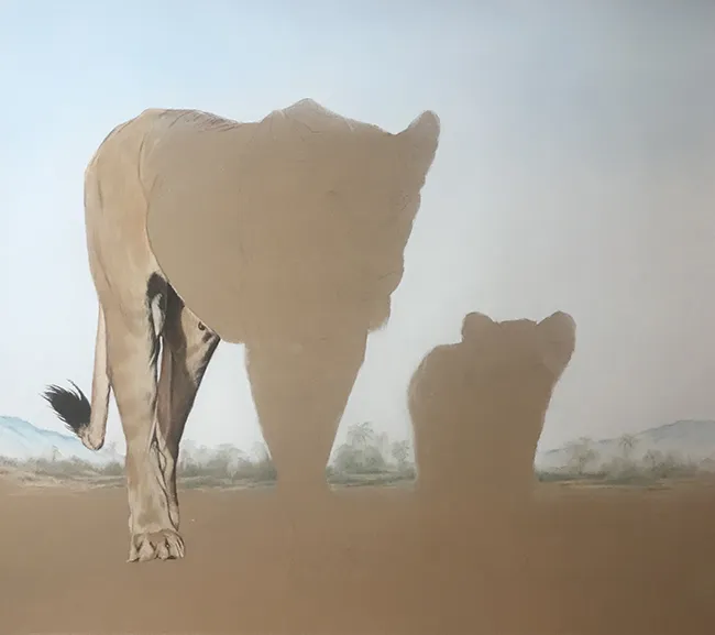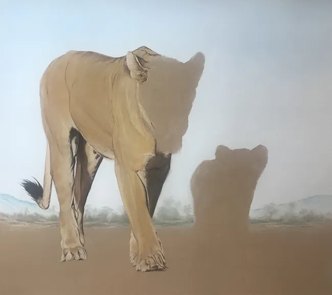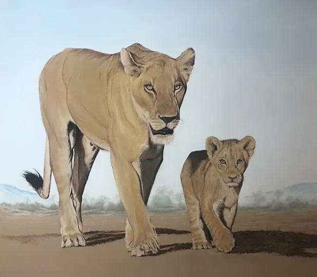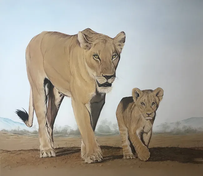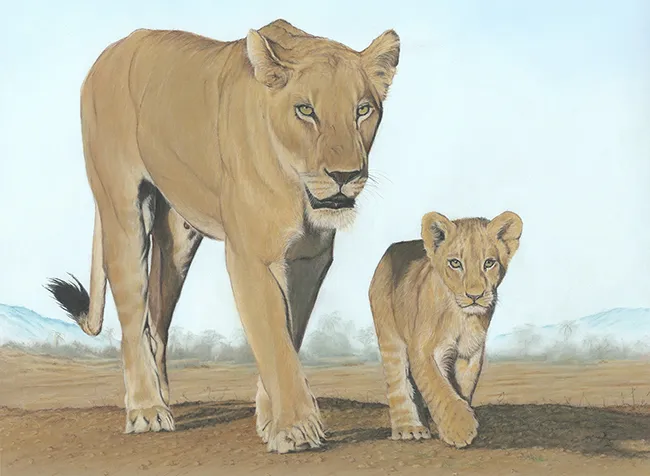This is a sketch of a lioness with her cub as they walk in step along a ridge