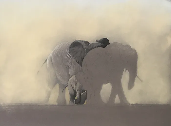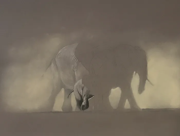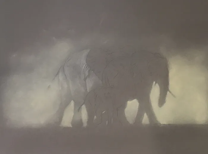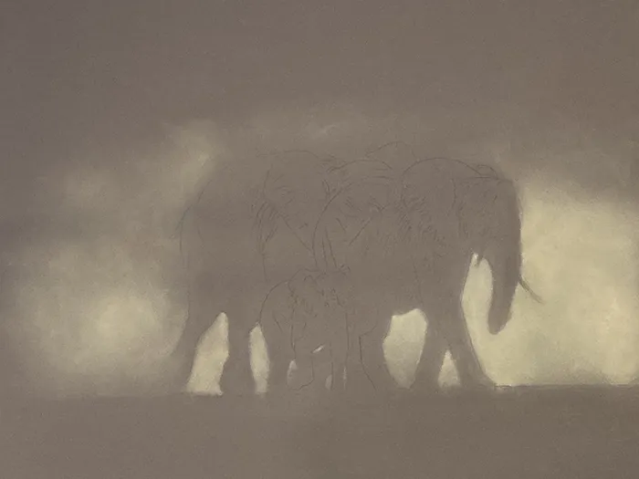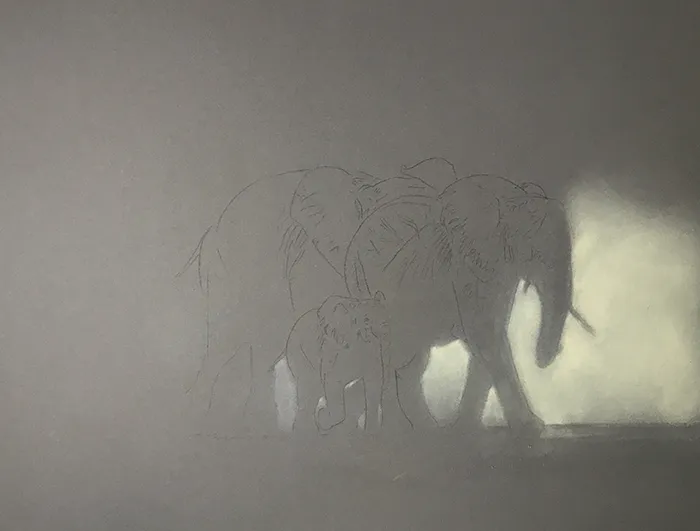 I worked on the back elephant then moved onto the darker shadowed rear of the calf