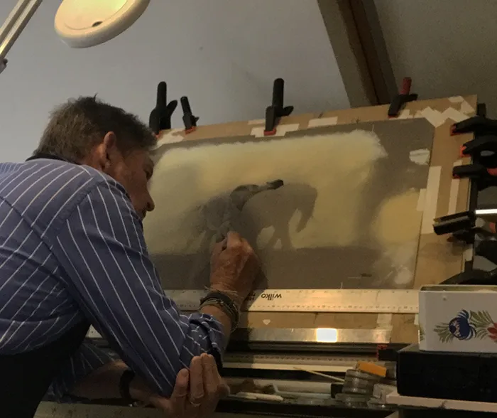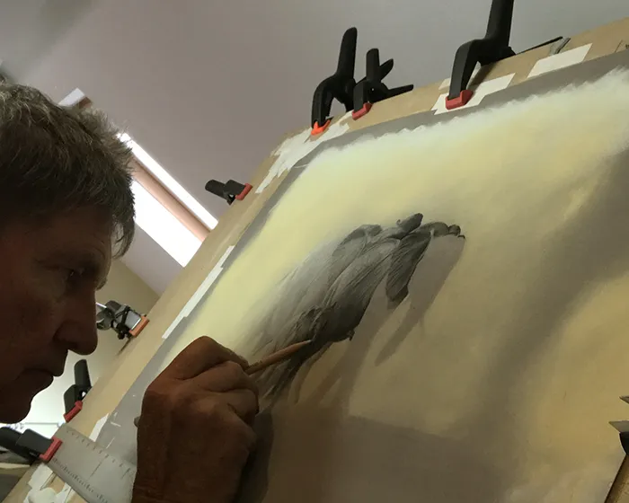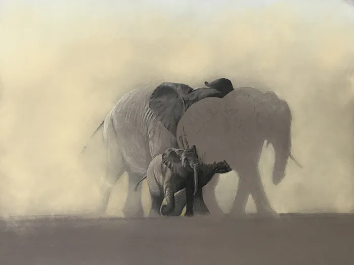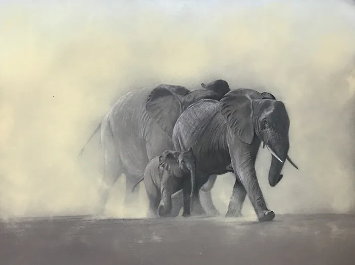 I'm at my easel working on some minor highlights on the baby elephants trunk