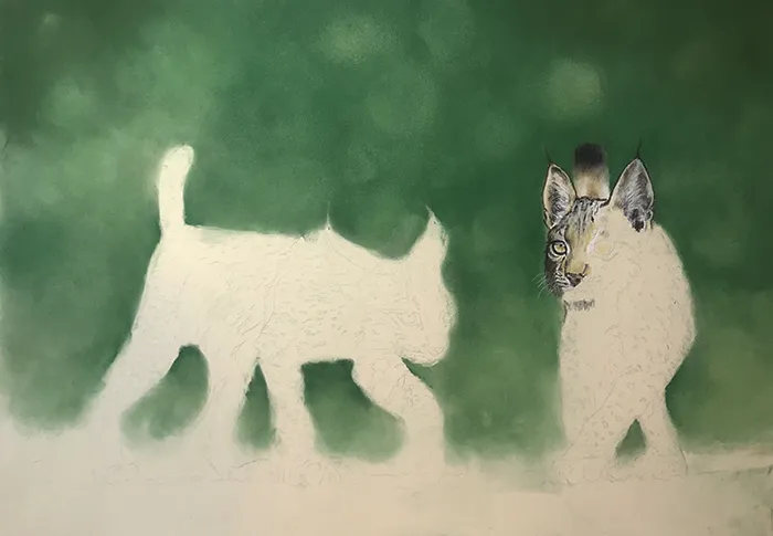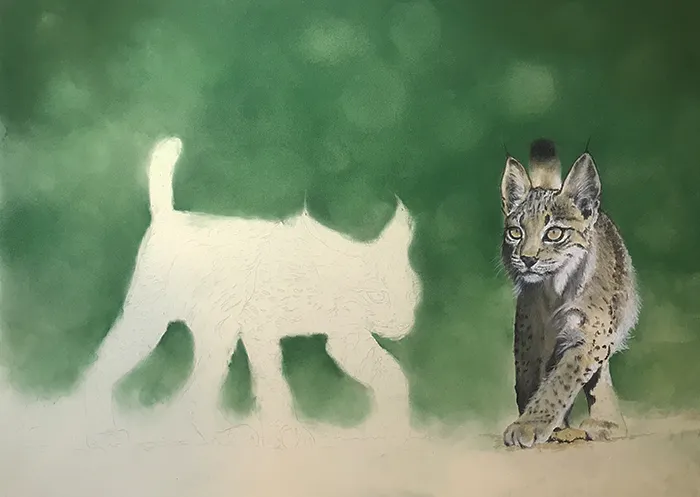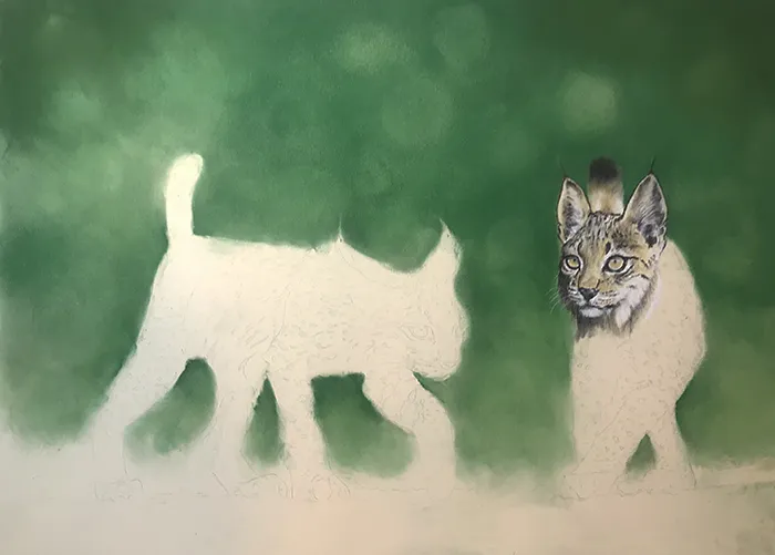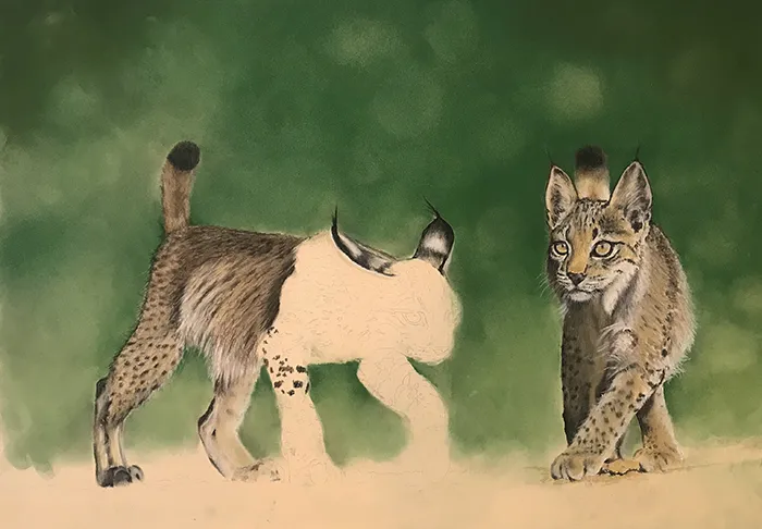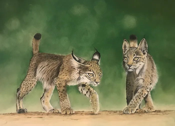 This ia a sketch of two Iberian Lynx kittens looking for trouble. It's been sketched using the medium of pastel on pastel paper whilst using a series of beautiful reference photographs taken by Ayala Fishaimer.