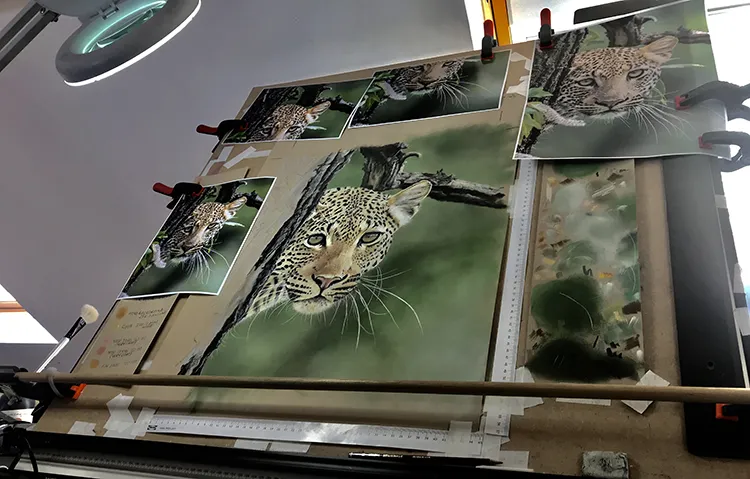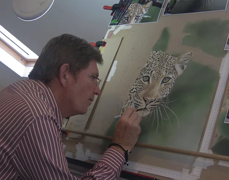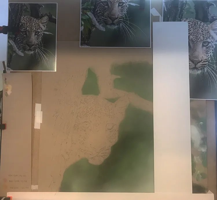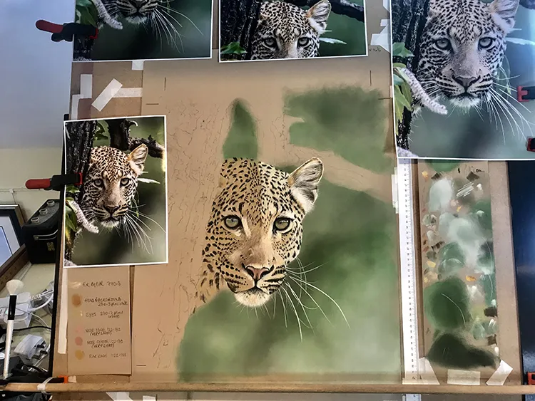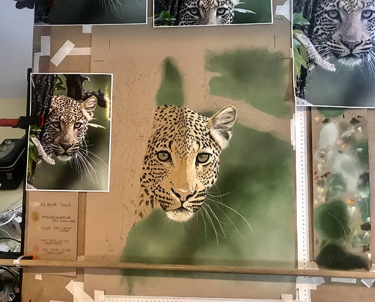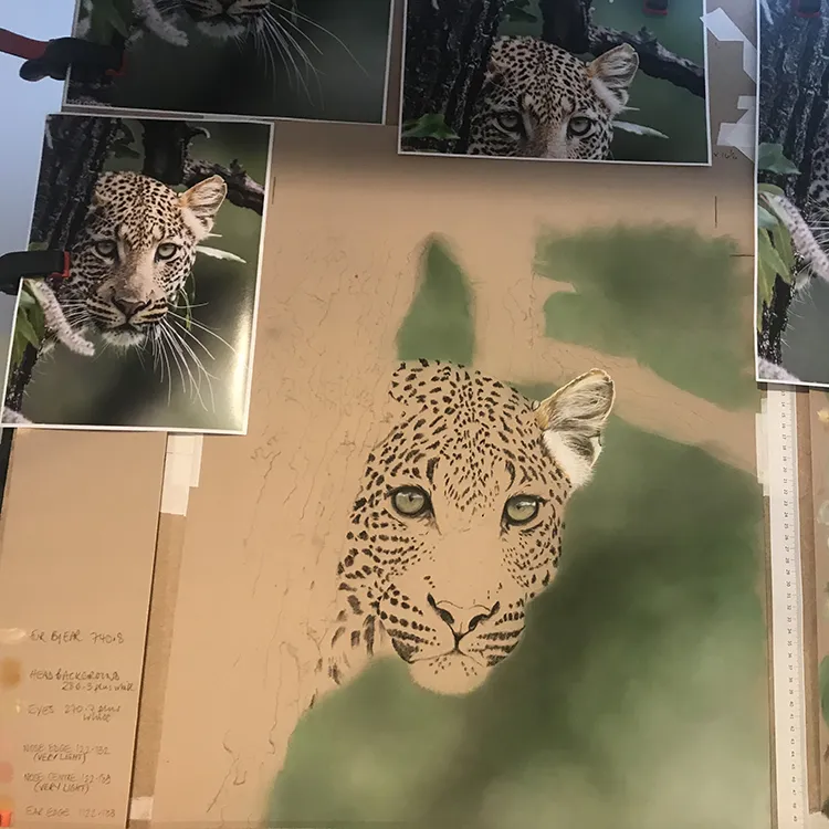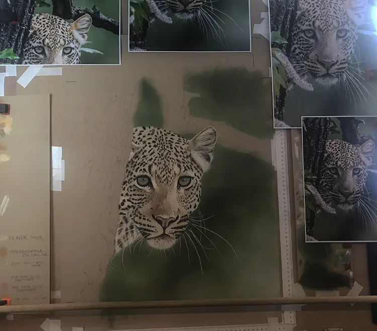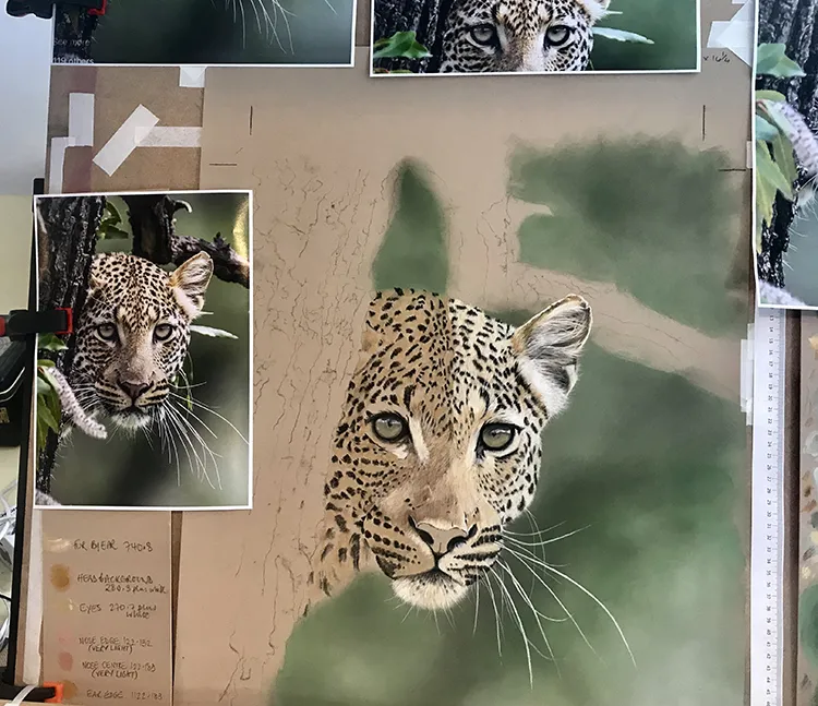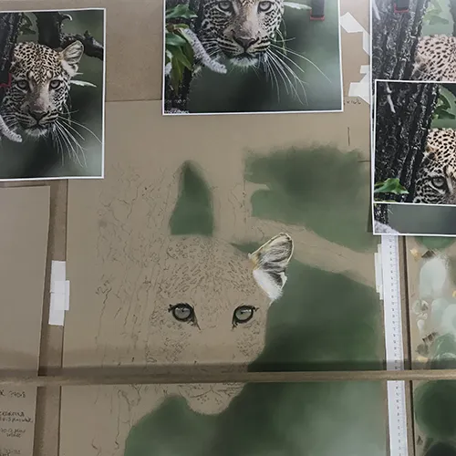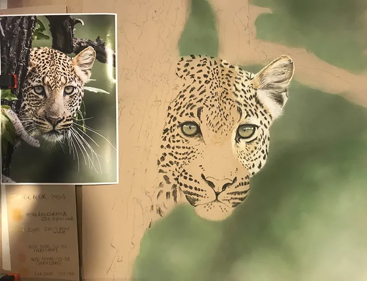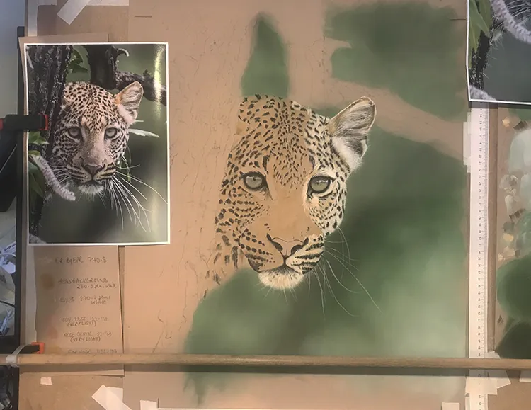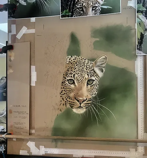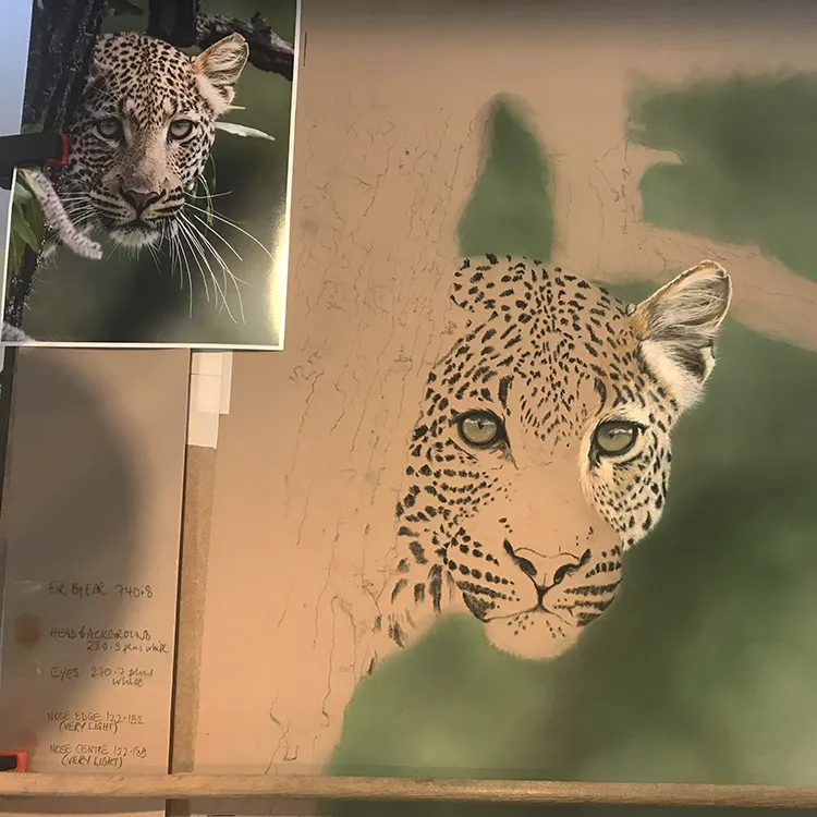I'm now gradually filling in the very distinctive markings that every leopard has. Using my cross stick to rest my wrist.