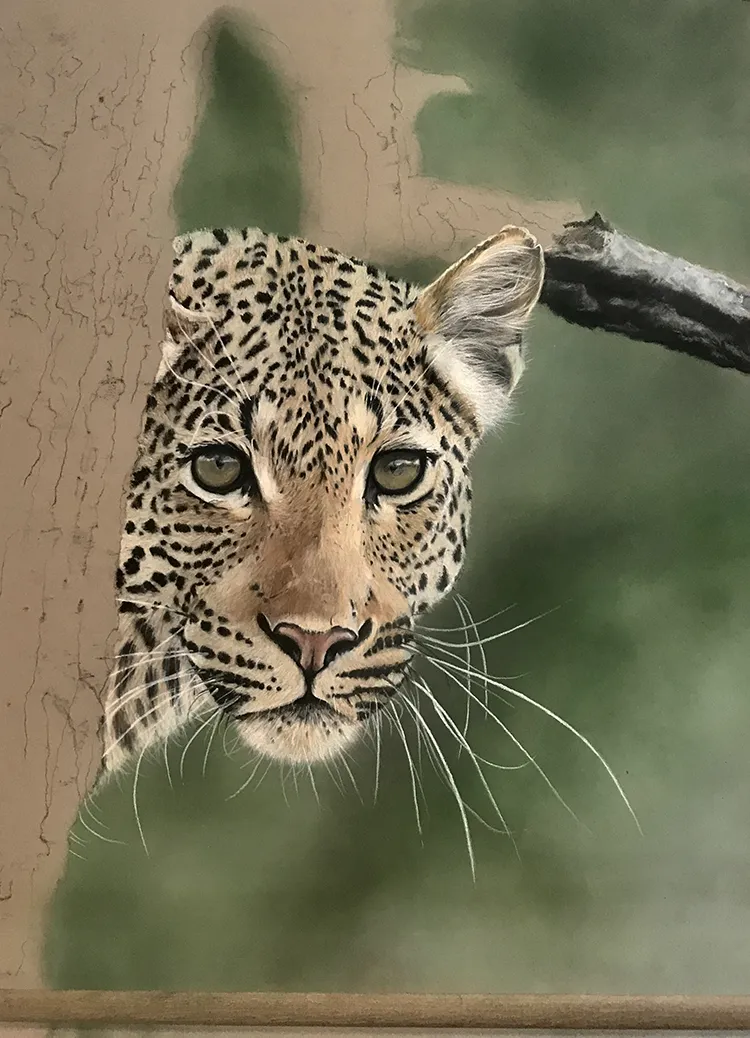 The gradual application of various shades of green pan pastel is used to create the dappling effect of the background