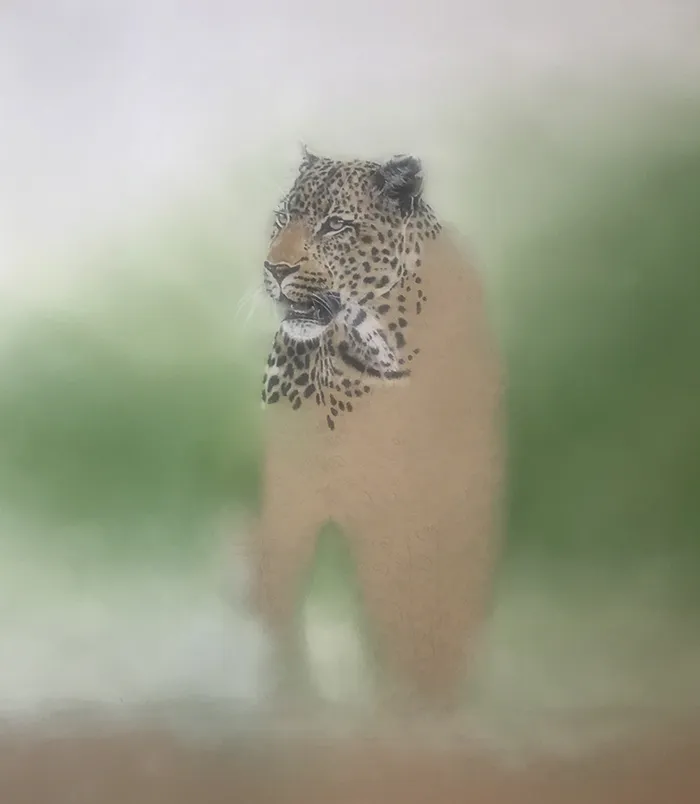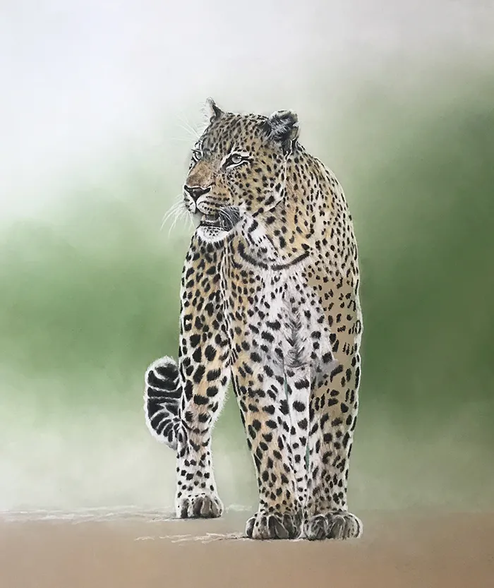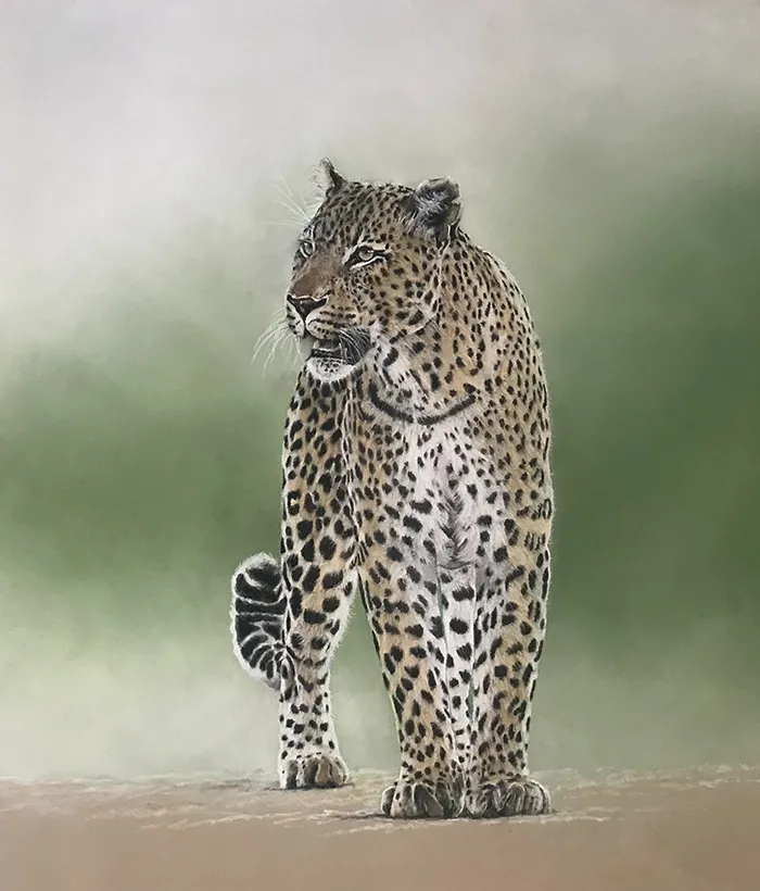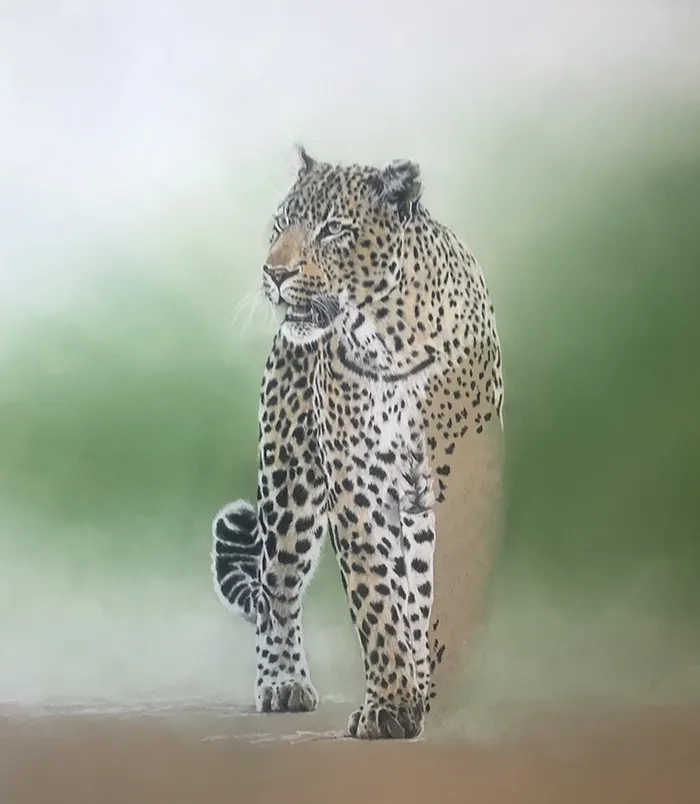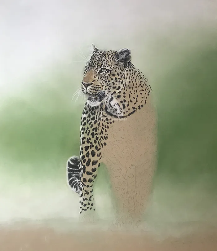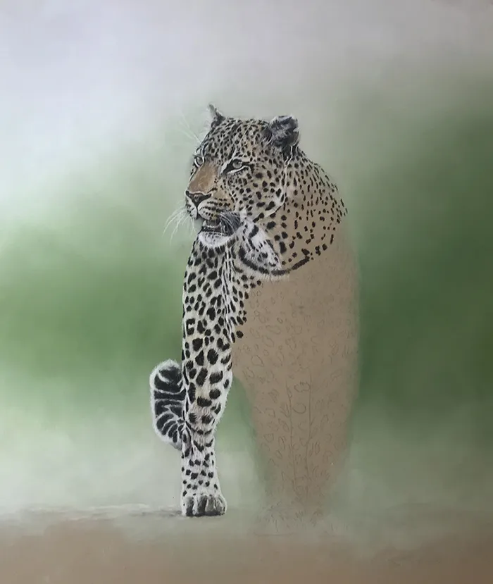 This sketch is an image of a beautiful male leopard taking a brief pause as it appears from out of the bush. I've sketched him using Pastel on a Clairefontaine paper.