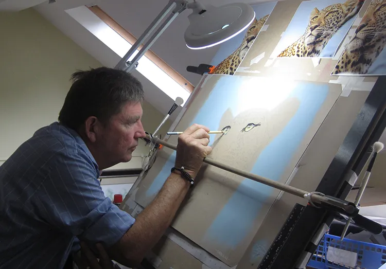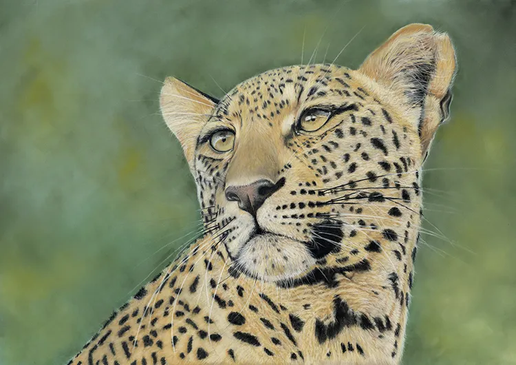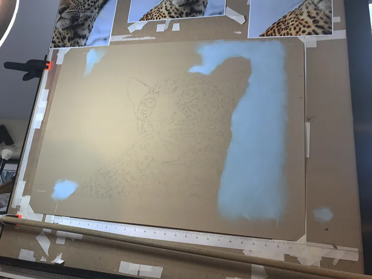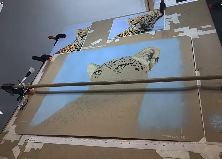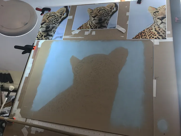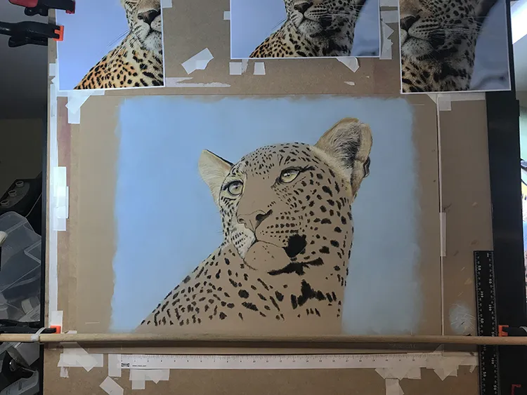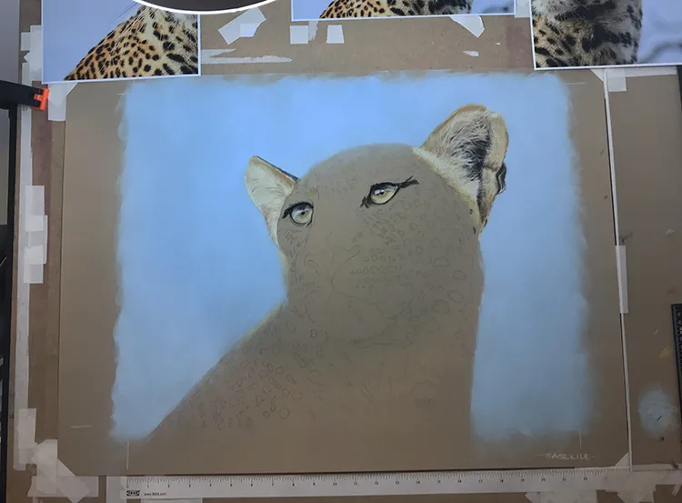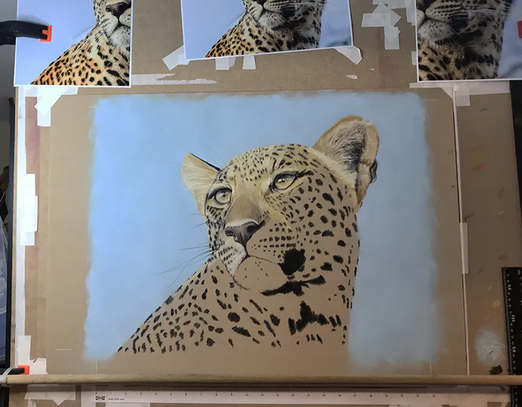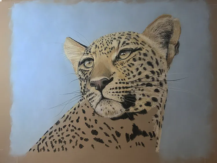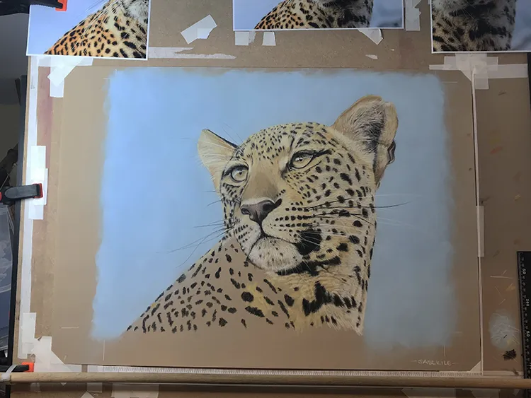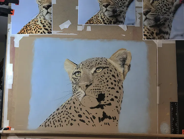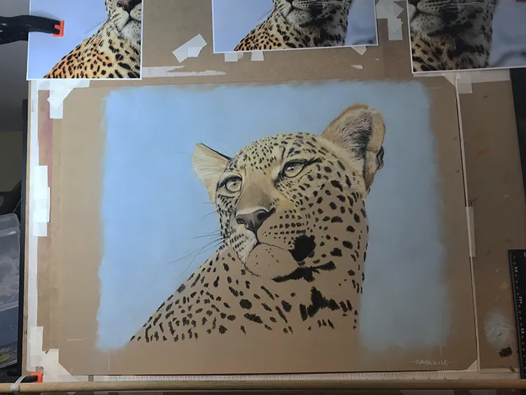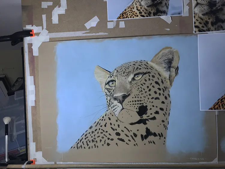 Gradually sponging in a Phthalo Blue Tint Pan Pastel for the sky which now outlines the leopard