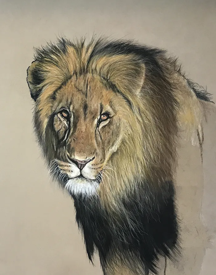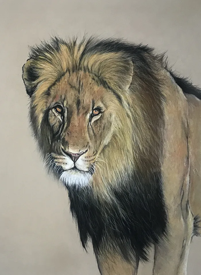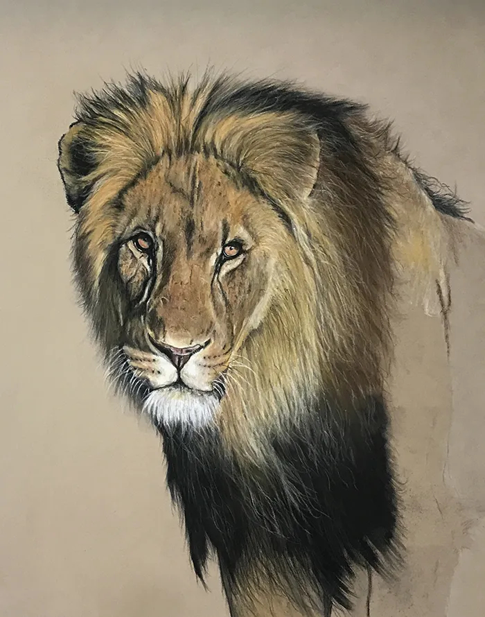 This is an image of a large old black and golden maned lion which I have sketched in the medium of Pastel on a PastelMat paper whilst using a beautiful photograph courtesy of Freda Strydom.