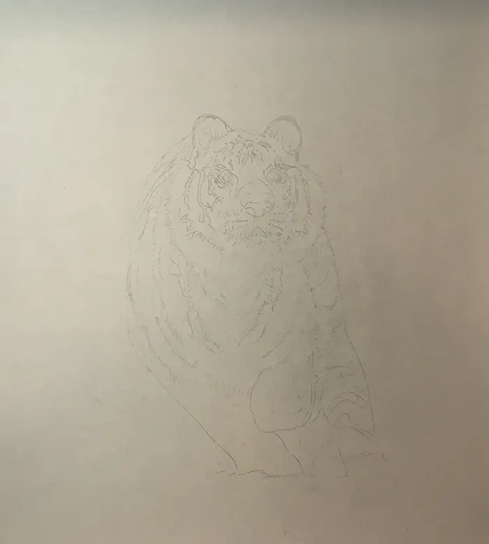 I began by lightly sketching in the outline features of the charging tiger