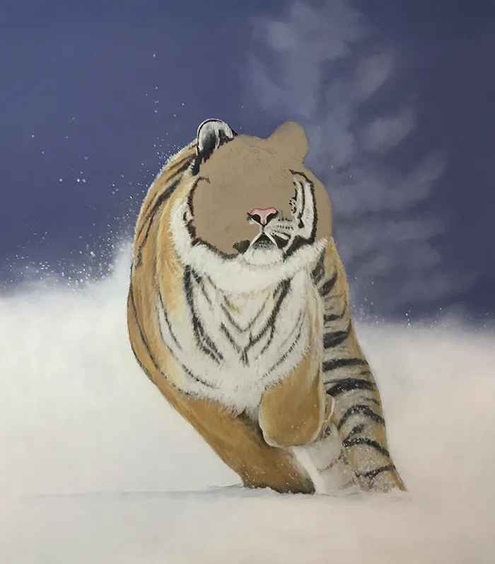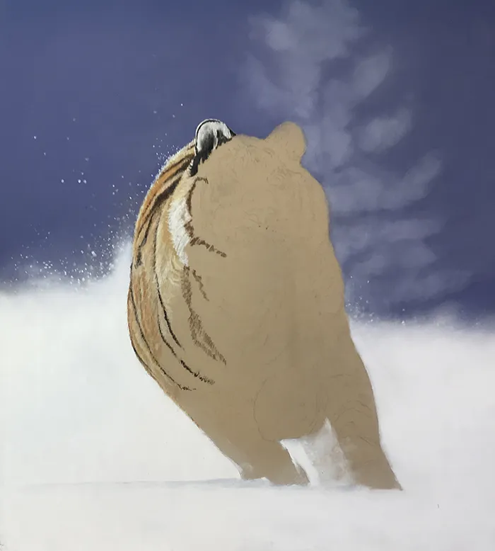 This image of an Amur Tiger exploding into a sudden charge has been sketched using the medium of soft and hard Pastels on a PastelMat paper.