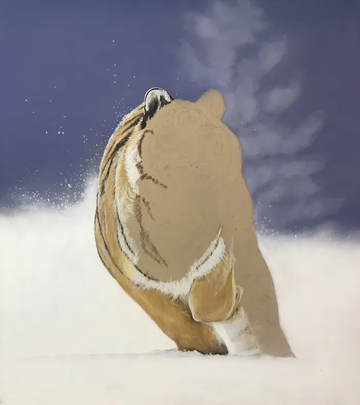 I also added a fir in the background before then starting on the tigers right flank & ear