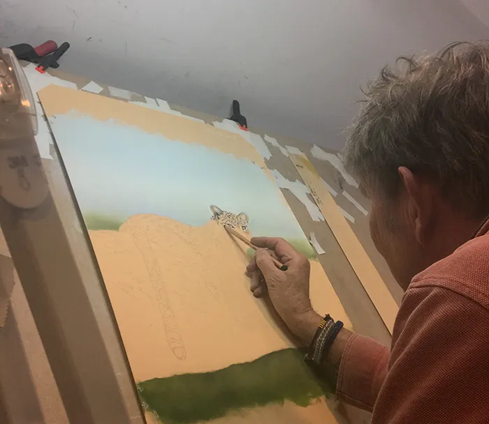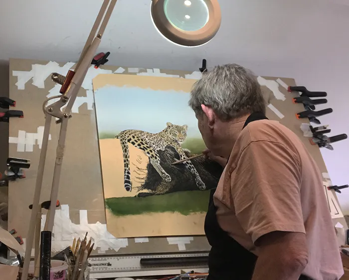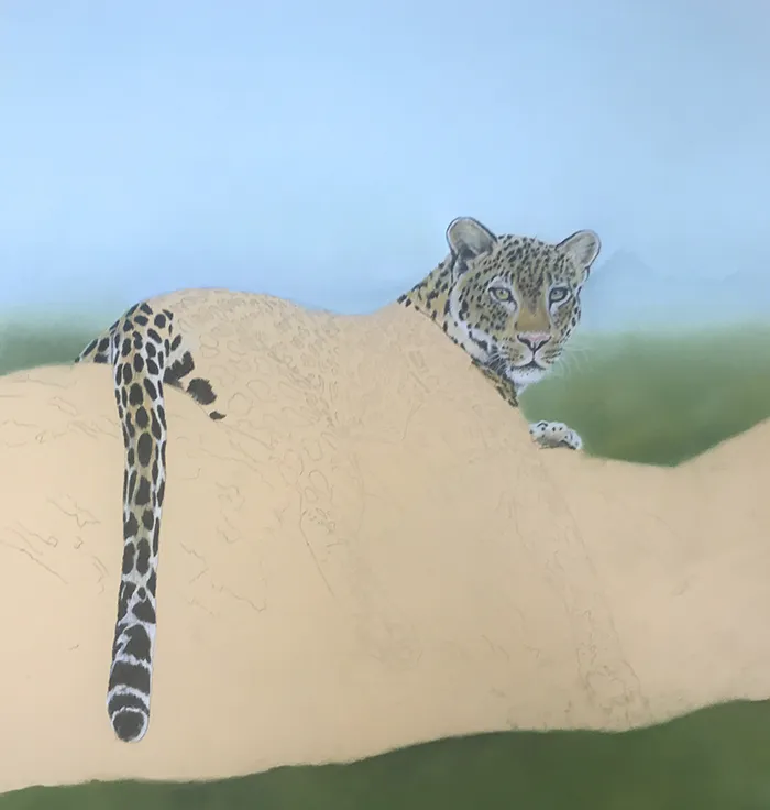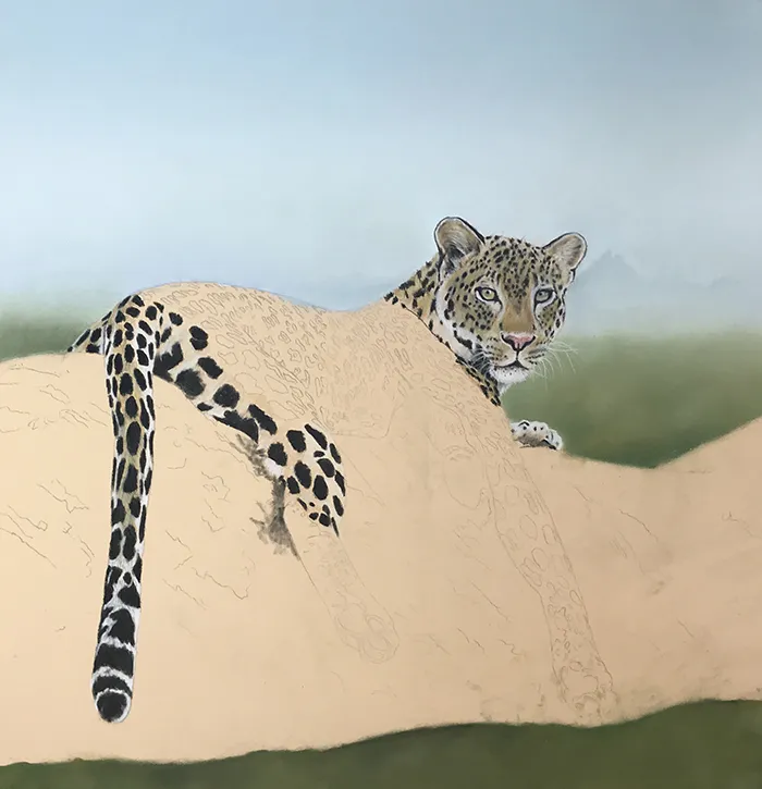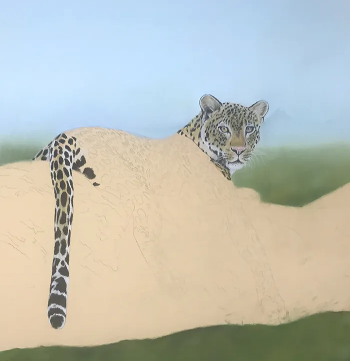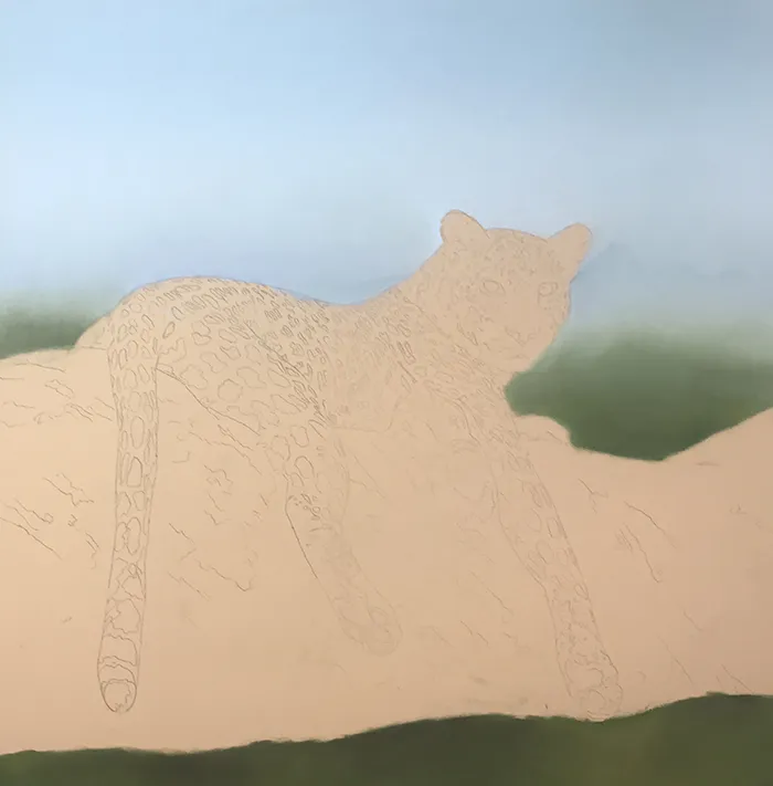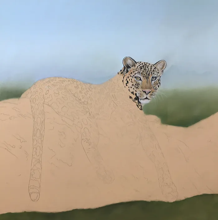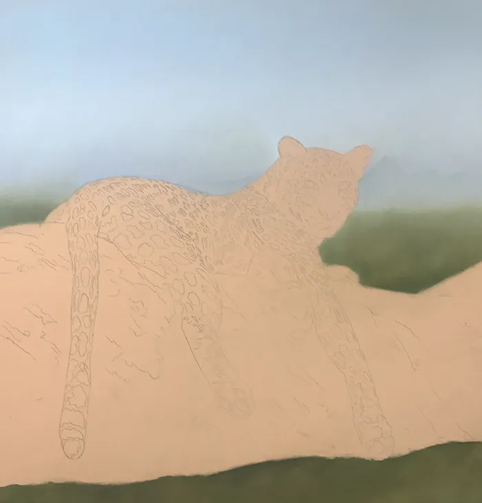 I then added a suggestion of tree tops below, before moving onto the leopard's face