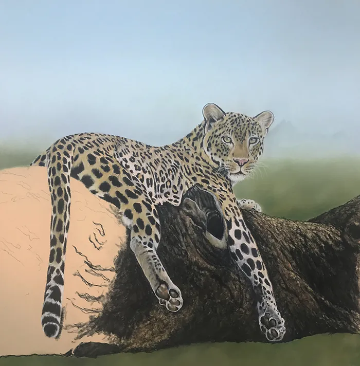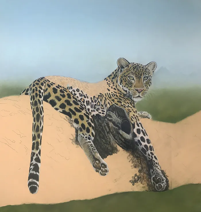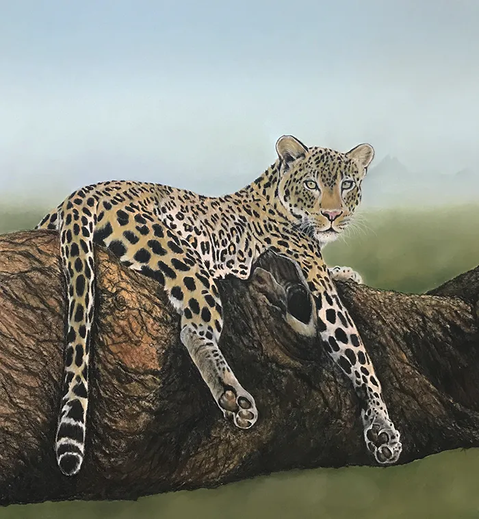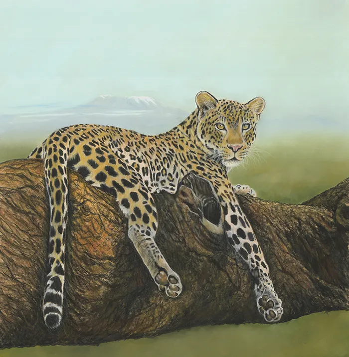 This image of a leopard reclined on a large branch with Mt Kilimanjaro in the background has been sketched in the medium of Pastels on a PastelMat paper whilst using a beautiful photograph courtesy of Tina Marie