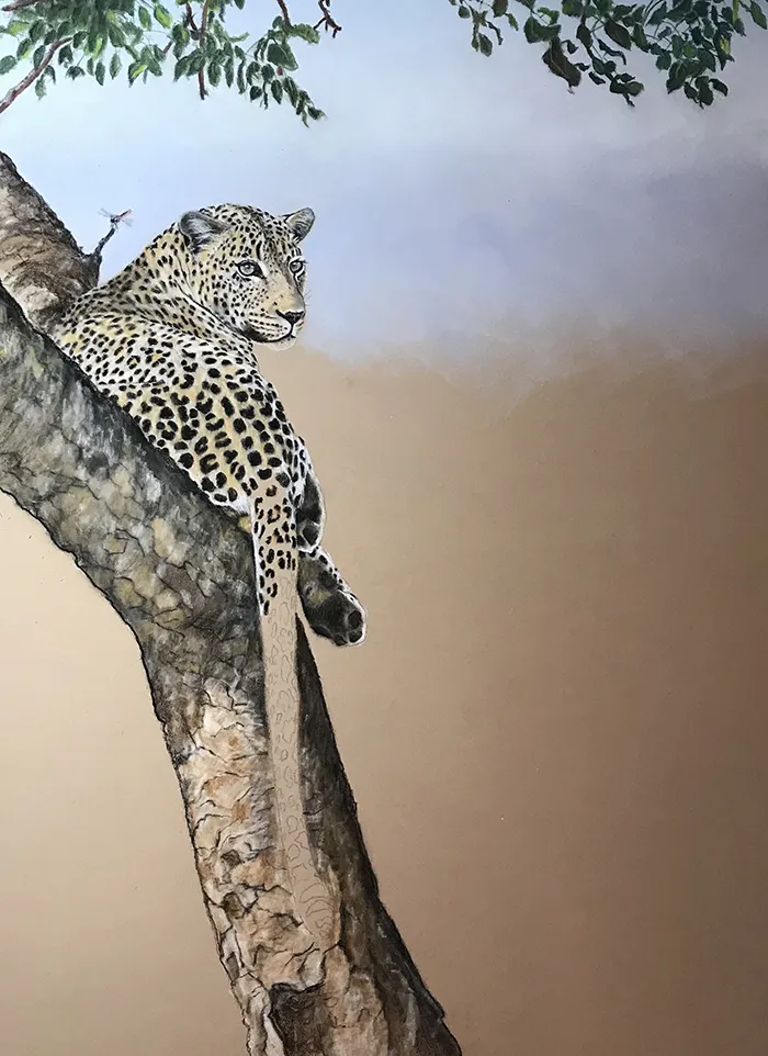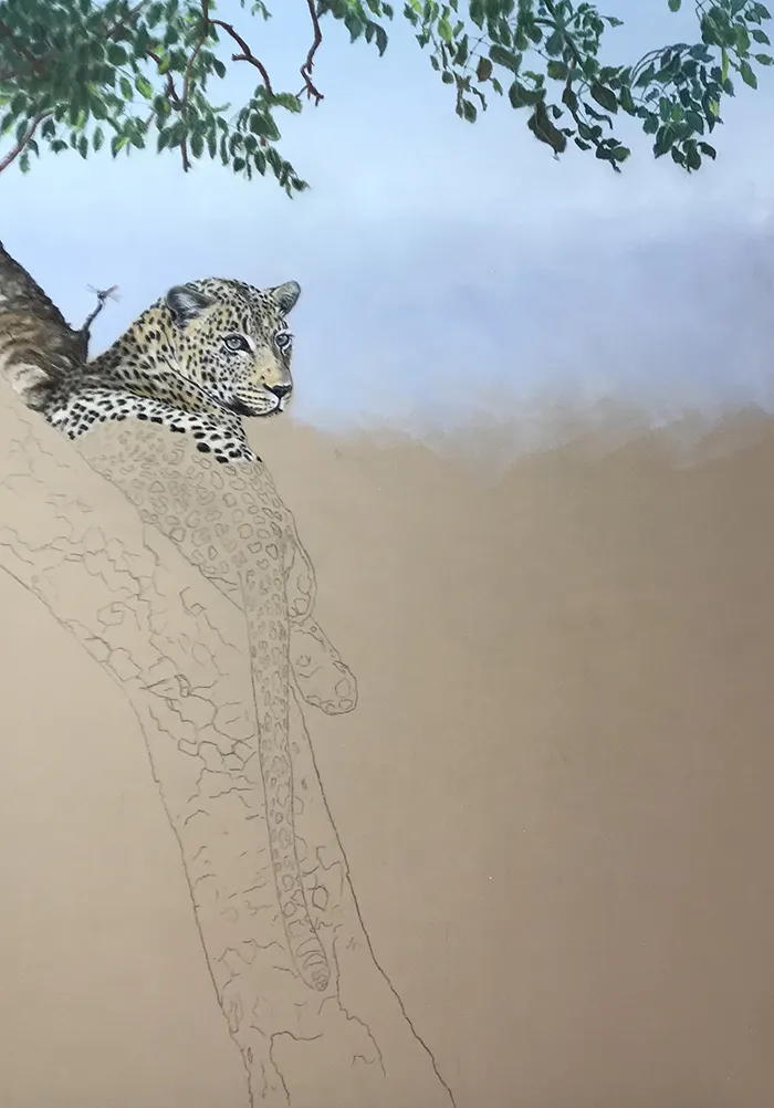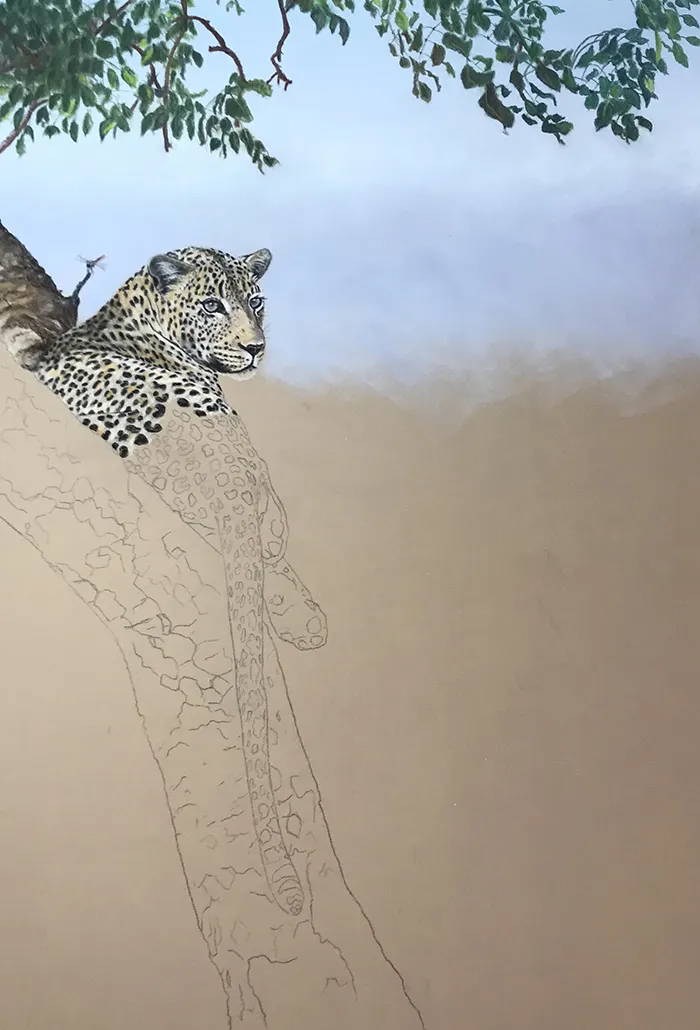 I've started by adding a light sketch of the leopard that's relaxed in the fork of the tree
