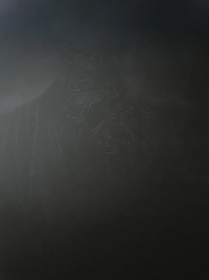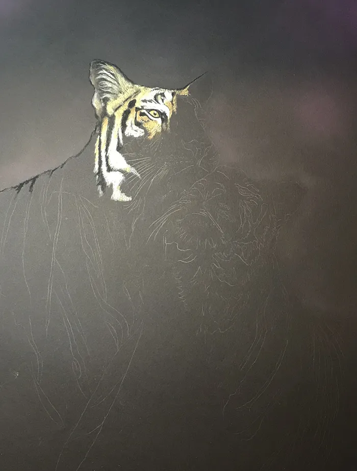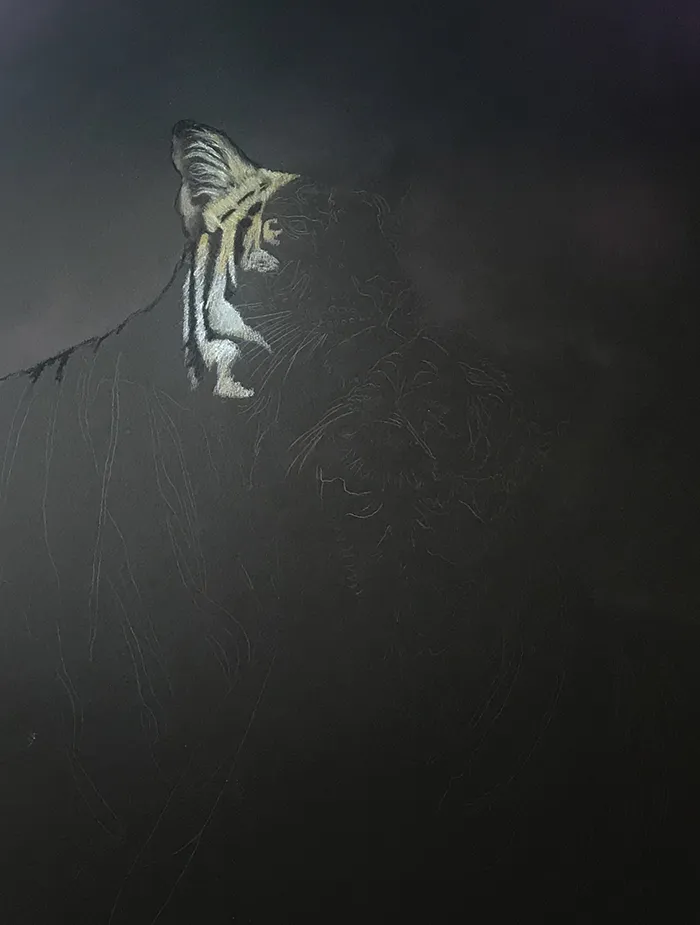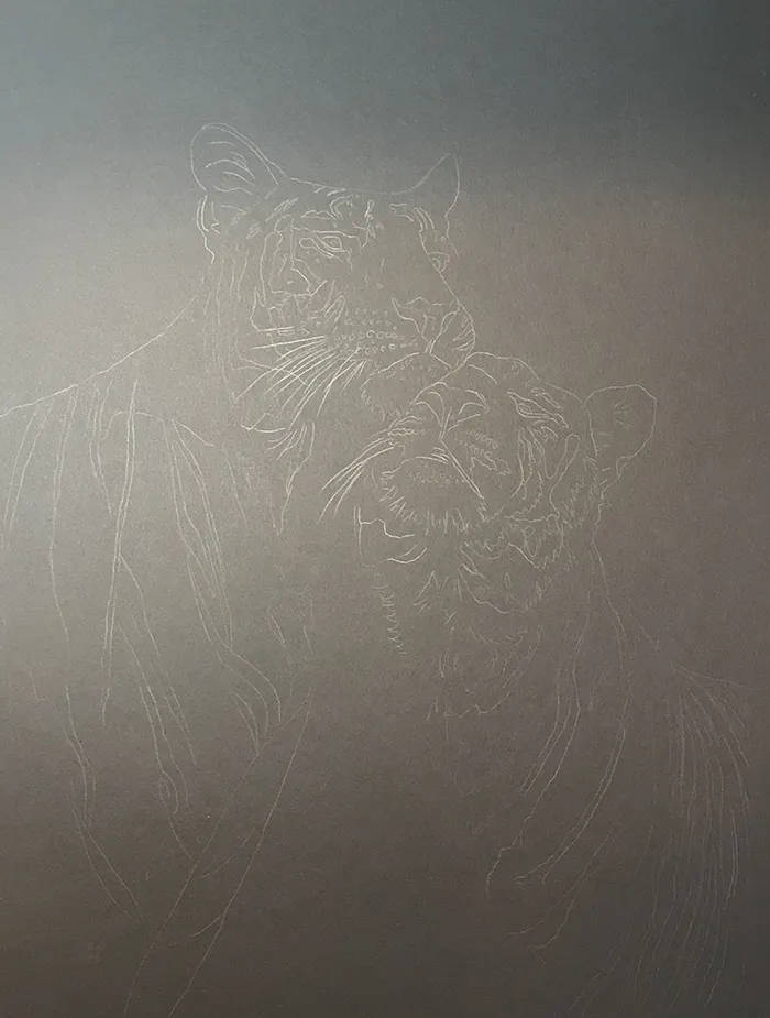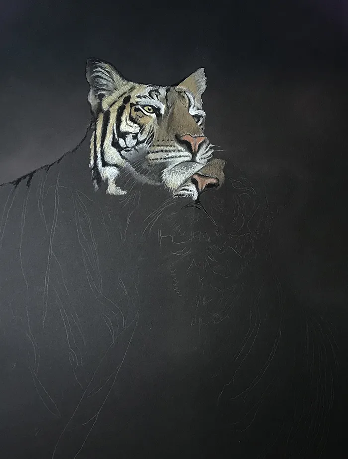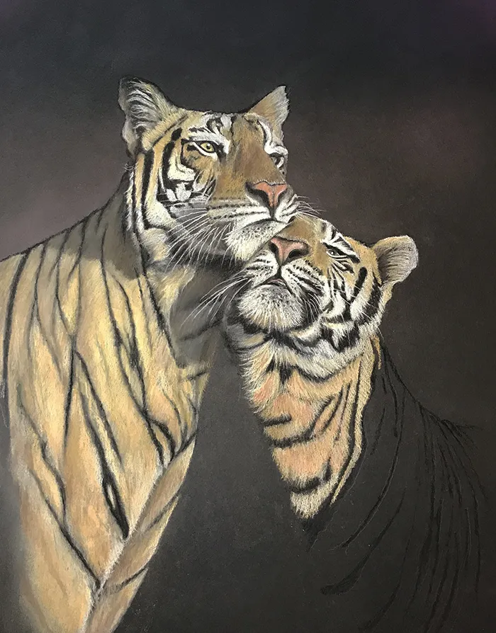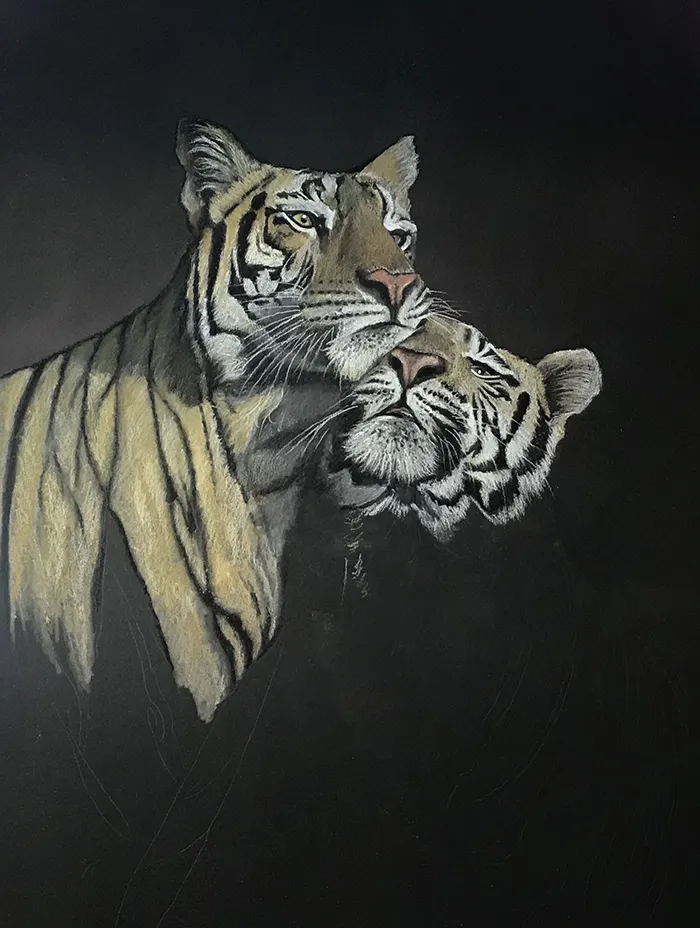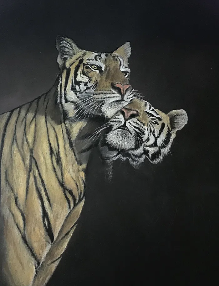 This is an intimate image of a tigress being nuzzled by her older cub which I have sketched using Pastels, Chalk and also Charcoal on a black background