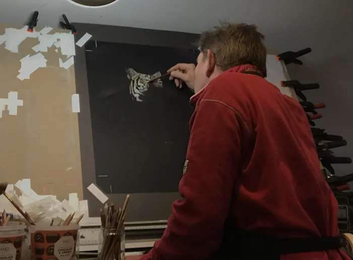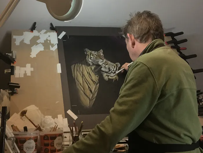 I pencilled in a faint outline of the tigers and have then added a soft highlit background