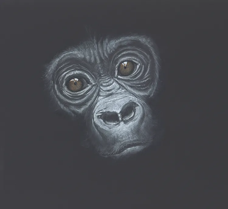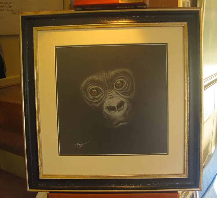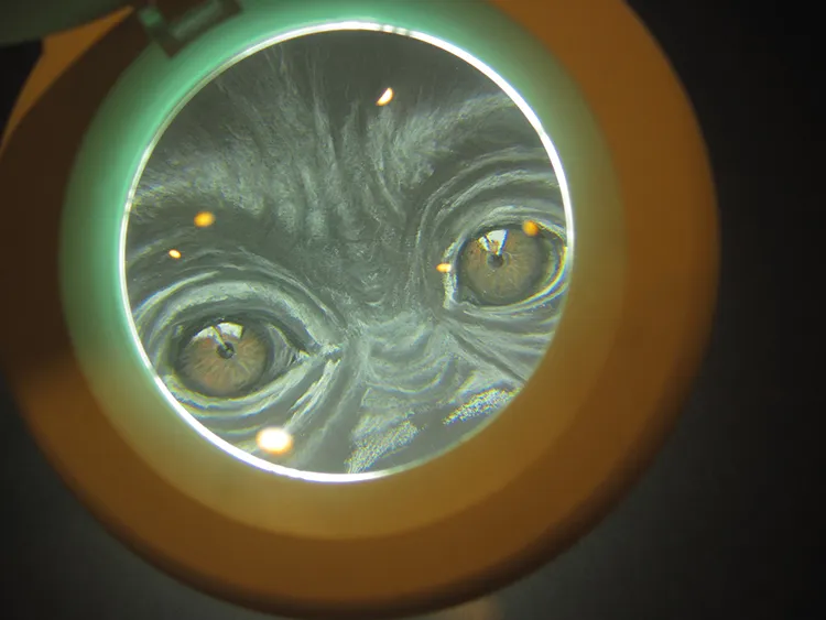 Using the light Magnifier as I work on the eyes of the young gorilla, My view of the eys as I work on them