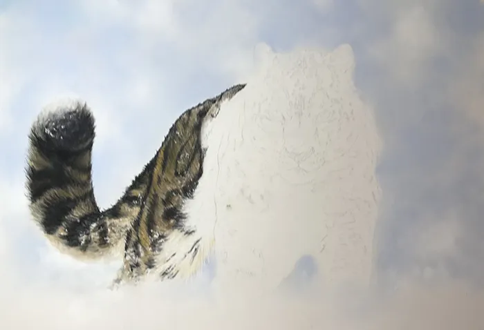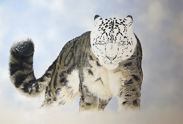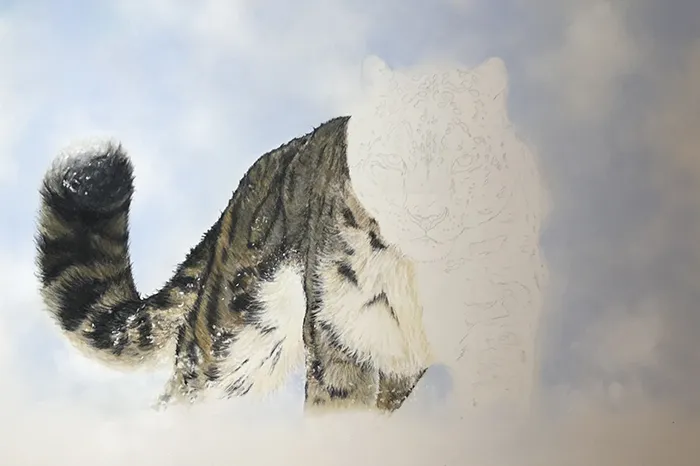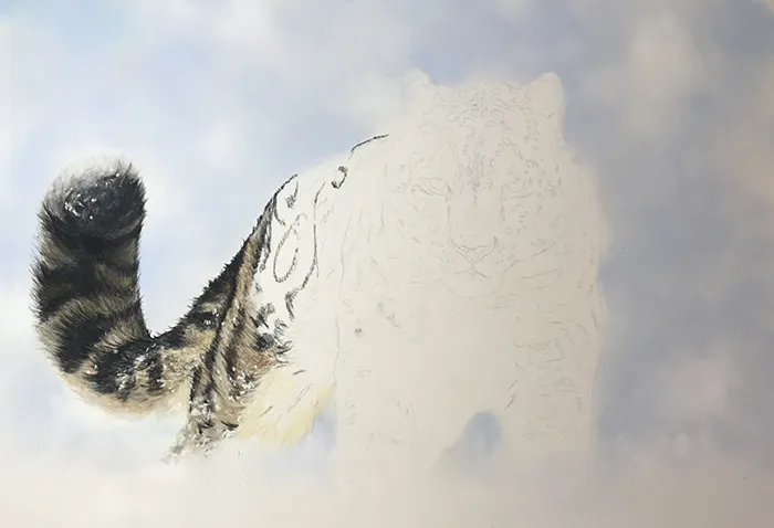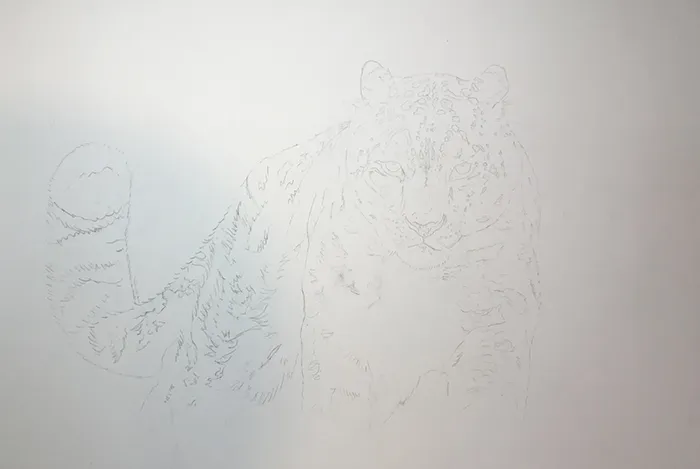 I've now lightly sketched in a rough outline of the snow leopard. The image size is 24in X 16in