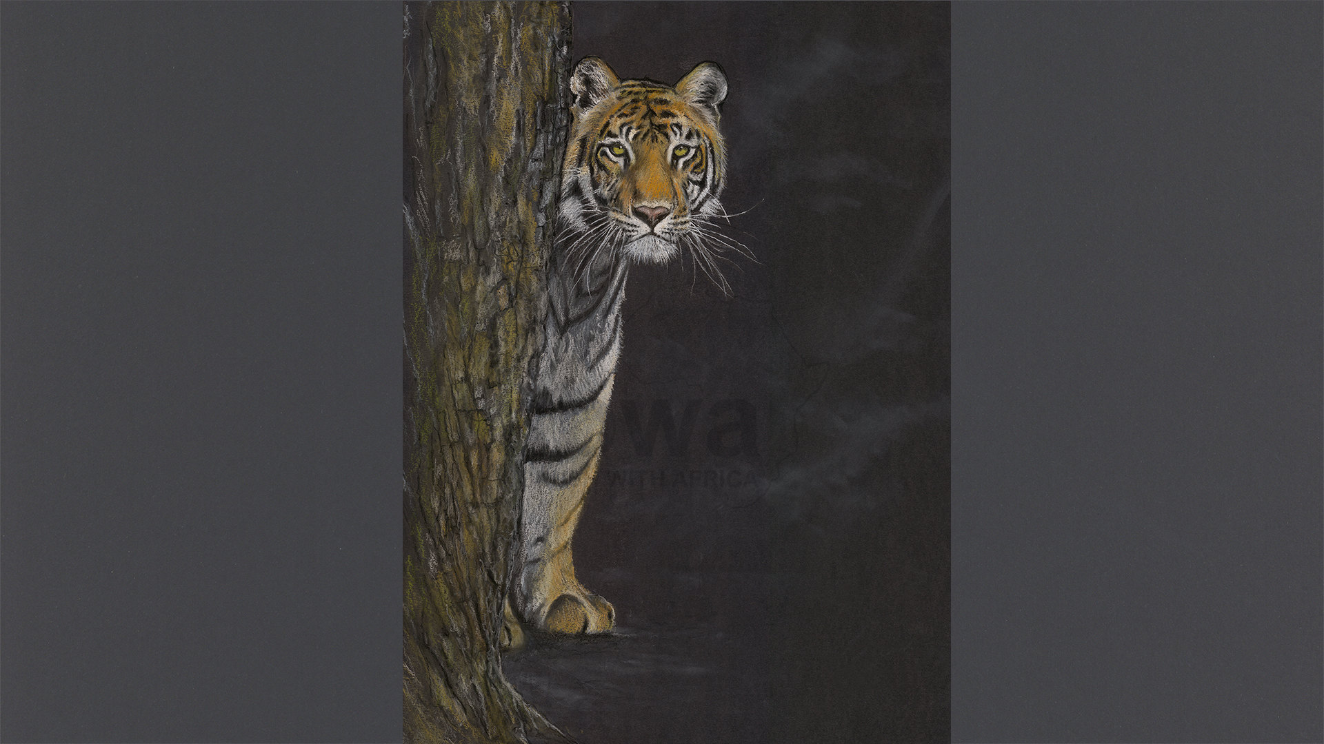 Click to enlarge Hide and Seek A tiger appears from behind a tree.. Product NameQuantityPrice Artist Sketch (12 X 9 Mounted) AU$ 80.00Mounted signed limited edition print 16 x 20 AU$ 160.00Signed Limited Edition Canvas 17 X 23 AU$ 320.00Signed Limited Edition Canvas 20 X 27 AU$ 360.00Signed Limited Edition Canvas 24 X 32.5 AU$ 420.00Signed Limited Edition Canvas 28 X 38.5 AU$ 550.00Signed Limited Edition Print 17 X 23 AU$ 320.00Signed Limited Edition Print 20 X 27 AU$ 360.00Signed Limited Edition Print 24 X 32.5 AU$ 420.00Add to Basket The ORIGINAL is AVAILABLE for PURCHASE The image has been sketched in Pastels on a Black paper All sizes are in inches