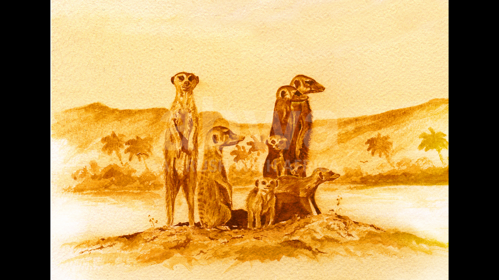 Click to enlarge Lookout A family of meerkats Product NameQuantityPrice Artist Sketch (12 X 9 Mounted) AU$ 80.00Signed Limited Edition Canvas 20 X 20 AU$ 310.00Signed Limited Edition Print 20 X 20 AU$ 310.00Signed limited edition print 17 X 17 AU$ 250.00Mounted signed limited edition print 16 x 16 AU$ 160.00Add to Basket This image has been painted using the unique medium of TEA and OCHRE pigment ORIGINAL SOLD TO A PRIVATE COLLECTOR All sizes are in inches.