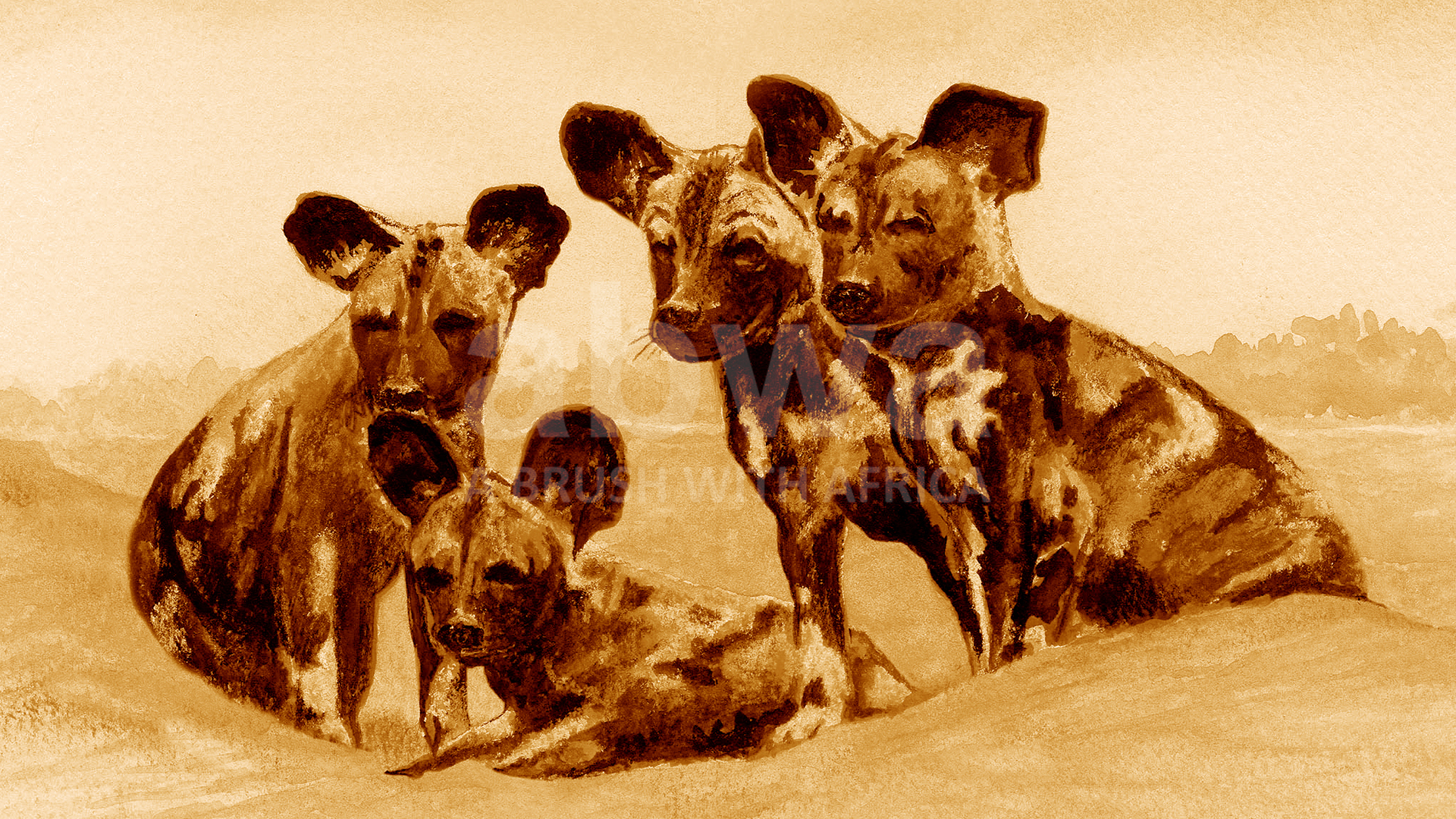 Click to enlarge Painted Pups Young Cape hunting dogs sit at the entrance to their den Product NameQuantityPrice Artist Sketch (12 X 9 Mounted) AU$ 80.00Signed Limited Edition Canvas 20 X 20 AU$ 310.00Signed Limited Edition Print 20 X 20 AU$ 310.00Signed limited edition print 15 X 15 AU$ 240.00Mounted signed limited edition print 20 x 16 AU$ 160.00Add to Basket This image has been painted using the unique medium of TEA and OCHRE pigment ORIGINAL SOLD TO A PRIVATE COLLECTOR All sizes are in inches.