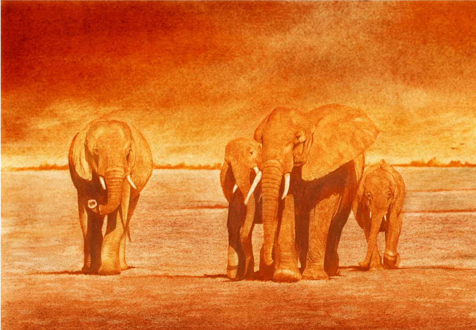 Click to enlarge Red Rains Left Elephants covered in red ochre Product NameQuantityPrice Artist Sketch (12 X 9 Mounted) AU$ 80.00Signed Limited Edition Canvas 30 X 20 AU$ 350.00Signed Limited Edition Print 24 x 18 AU$ 290.00Mounted signed limited edition print 20 x 16 AU$ 160.00Add to Basket This image has been painted using the unique medium of TEA and OCHRE pigment ORIGINAL SOLD TO A PRIVATE COLLECTOR All sizes are in inches.
