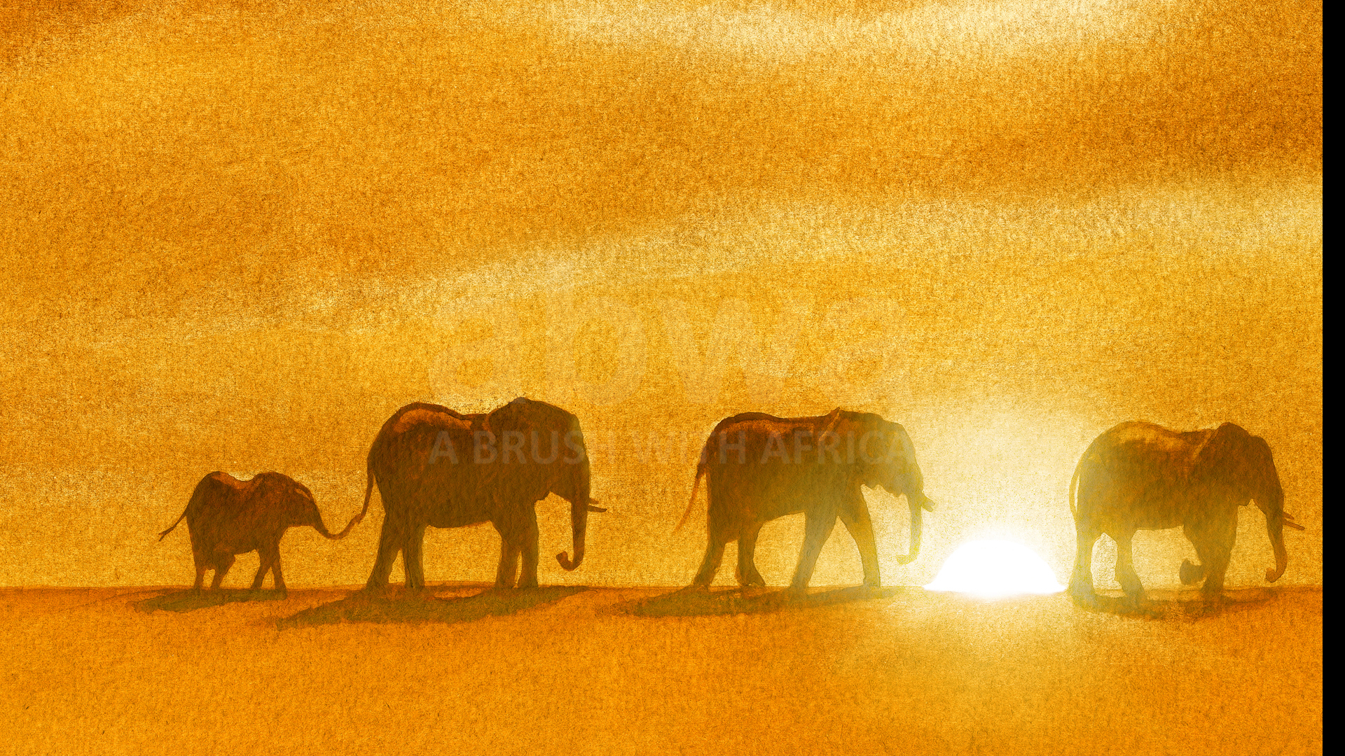Click to enlarge Sundowner A small herd of elephants at sundown. Product NameQuantityPrice Artist Sketch (12 X 9 Mounted) AU$ 80.00Signed Limited Edition Canvas 30 X 20 AU$ 350.00Signed Limited Edition Print 24 X 18 AU$ 290.00Mounted signed limited edition print 20 x 16 AU$ 160.00Add to Basket This image has been painted using the unique medium of TEA and OCHRE pigment ORIGINAL SOLD TO A PRIVATE COLLECTOR All sizes are in inches.