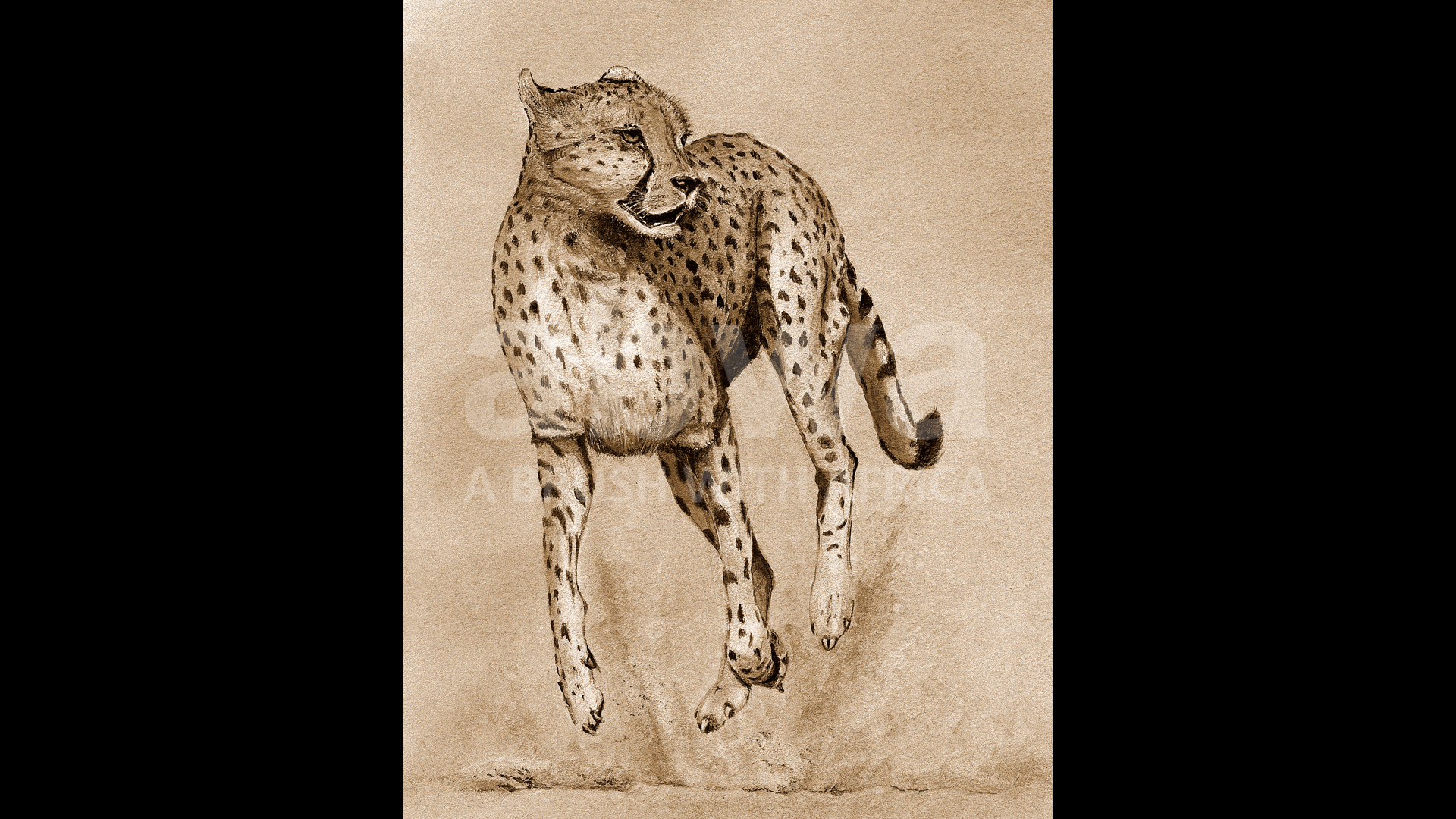 Click to enlarge The Spotted Assassin A cheetah bounces to a halt after a failed chase Product NameQuantityPrice Artist Sketch (9 X 12 Mounted) AU$ 80.00Signed Limited Edition Canvas 20 X 30 AU$ 310.00Signed Limited Edition Print 18 X 24 AU$ 290.00Mounted signed limited edition print 16 x 20 AU$ 160.00Signed Limited Edition Print 18 X 24 AU$ 290.00Add to Basket This image has been painted using the unique medium of TEA and OCHRE pigment ORIGINAL SOLD TO A PRIVATE COLLECTOR All sizes are in inches.