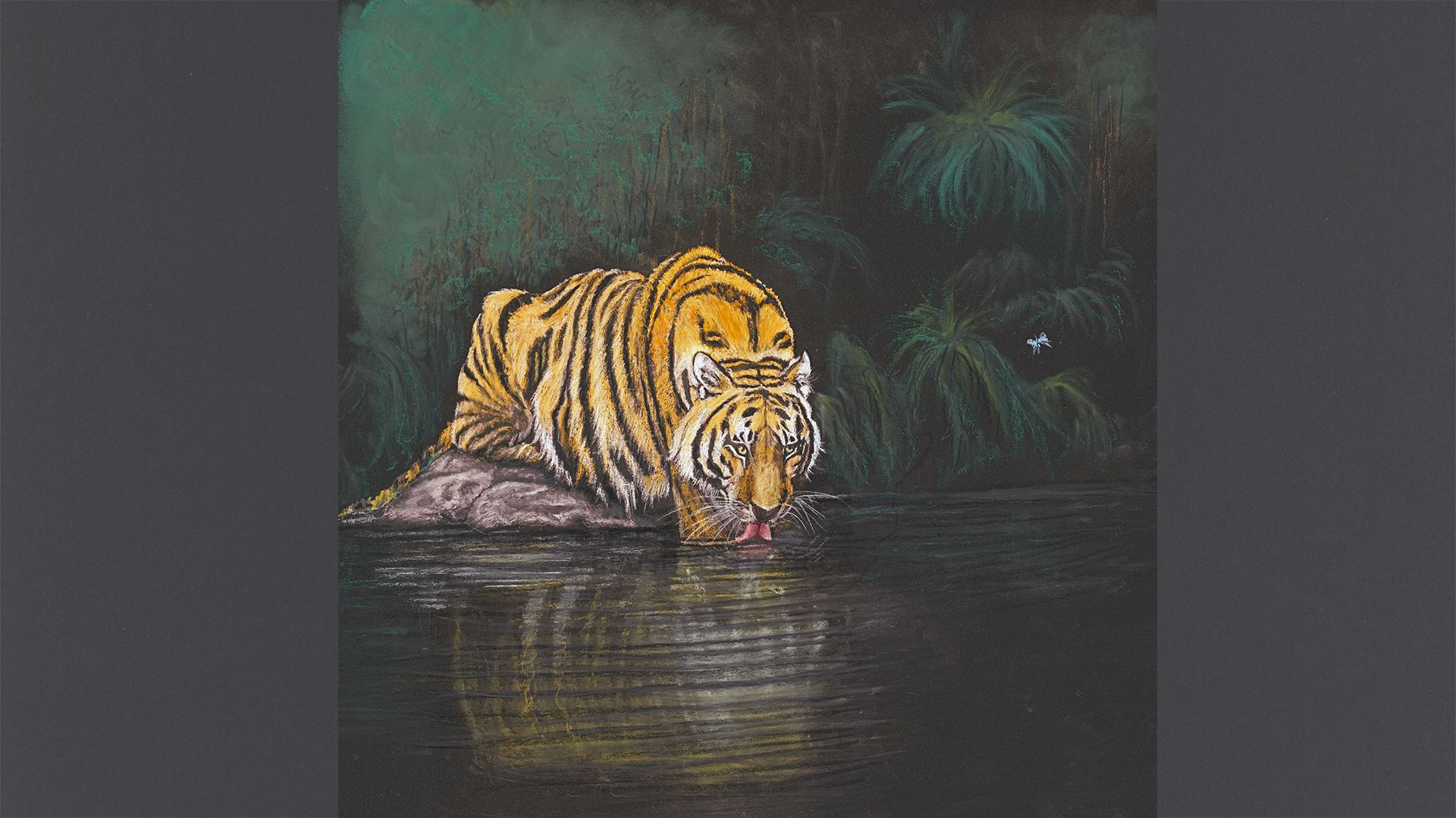 A Bengal Tiger crouches at the rivers edge to have cool drink of water