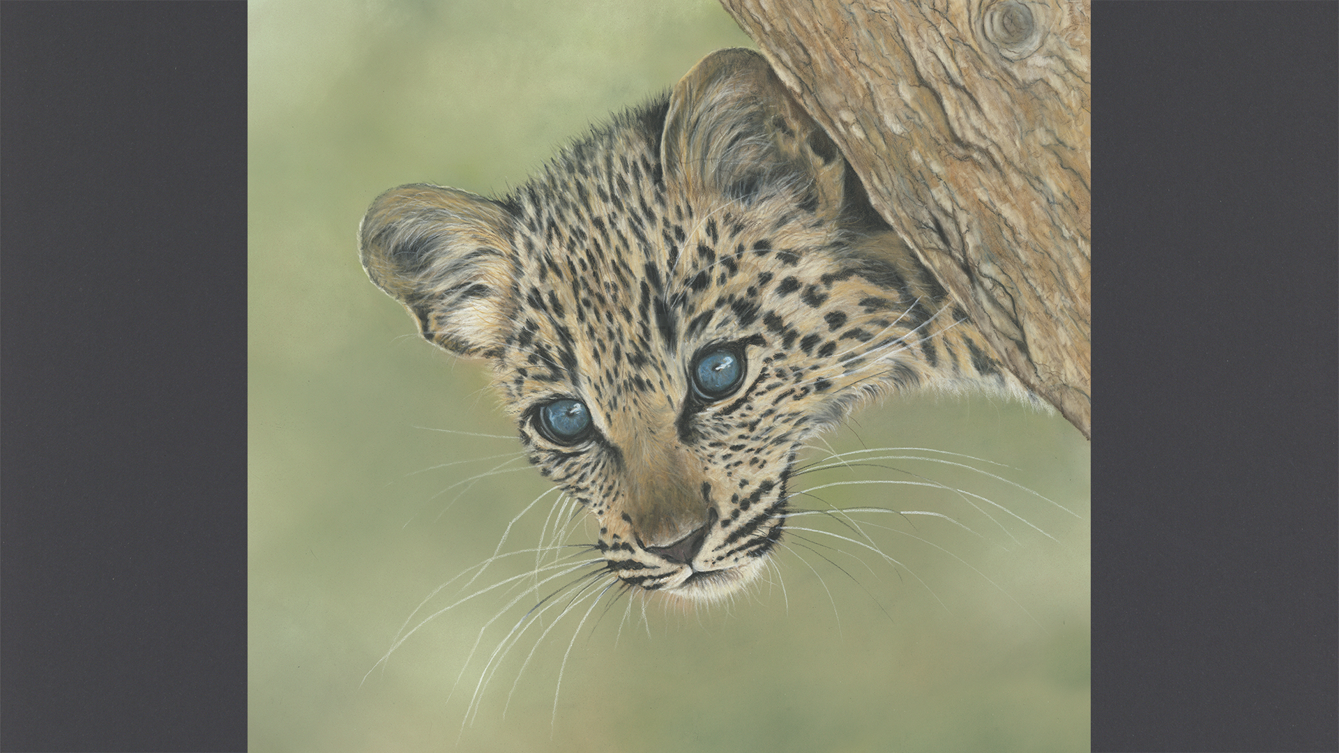 A young leopard cub peers from behind a tree branch. The blueness of its eyes is due to the small deposit of melanin in it's irises which gradually fades as it gets older..