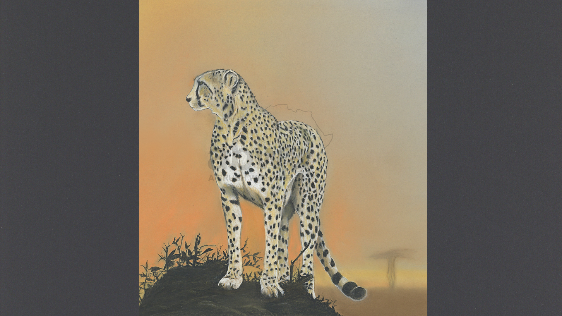 A female cheetah looks out over the savannah from a small termite mound at dawn